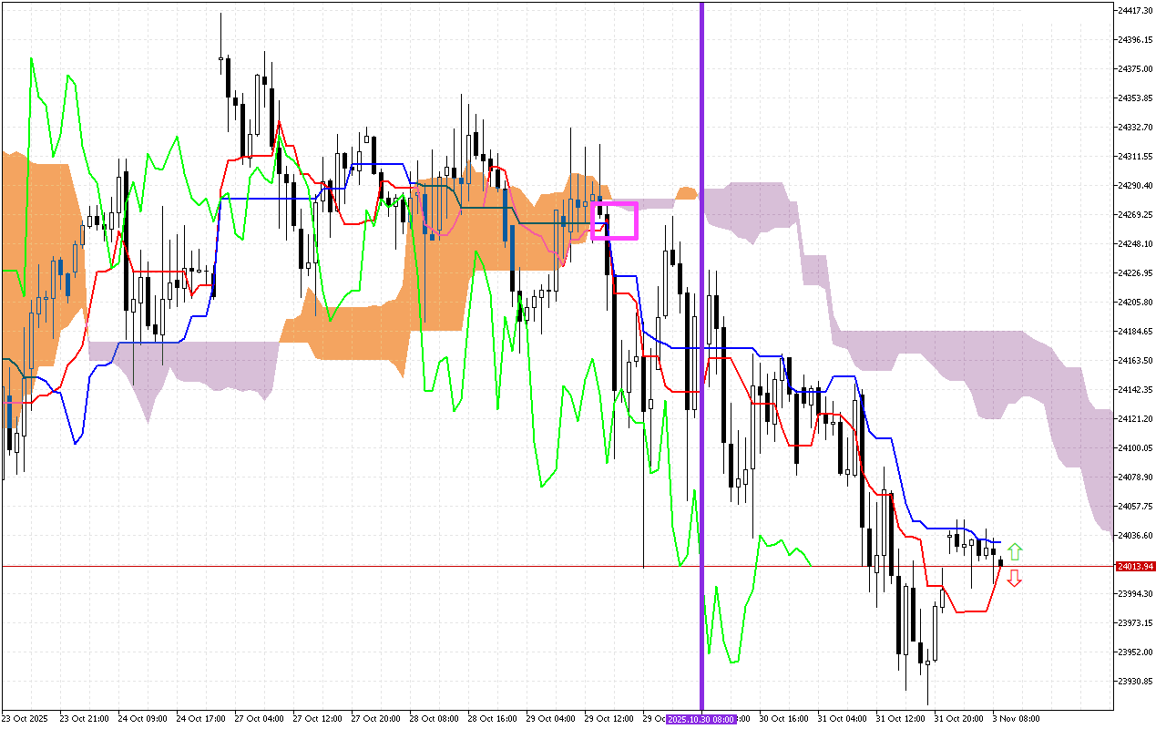 ሁለተኛው አስፈላጊ ምልክት በግራፉ ላይ ቀጥ ያለ ሐምራዊ መስመር ያለበት የKumo ደመና ቀለም ለውጥ ነው። በደመና ውስጥ የሊላክስ ቀለም መታየት ወደ ታች የመንቀሳቀስ ቅድሚያ የሚሰጠውን ለውጥ ያሳያል።