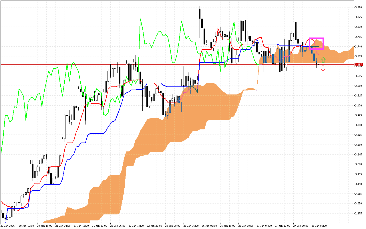ያለፉትን የግብይት ክፍለ-ጊዜዎችን በመተንተን በሮዝ ካሬ ምልክት የተደረገባቸው የTenkan እና Kijun መስመሮች መገናኛ ላይ ትኩረት መስጠት ተገቢ ነው። ፈጣኑ የTenkan መስመር ከKijun መስመር በታች ወድቋል፣ይህም አብዛኛው ጊዜ የመውረድ አዝማሚያ ለውጥን ያሳያል። ነገር ግን፣ በኋላ ዋጋው ከTenkan መስመር በላይ ጨምሯል፣ ይህም የቁልቁለት ግፊት ድክመትን ያሳያል።