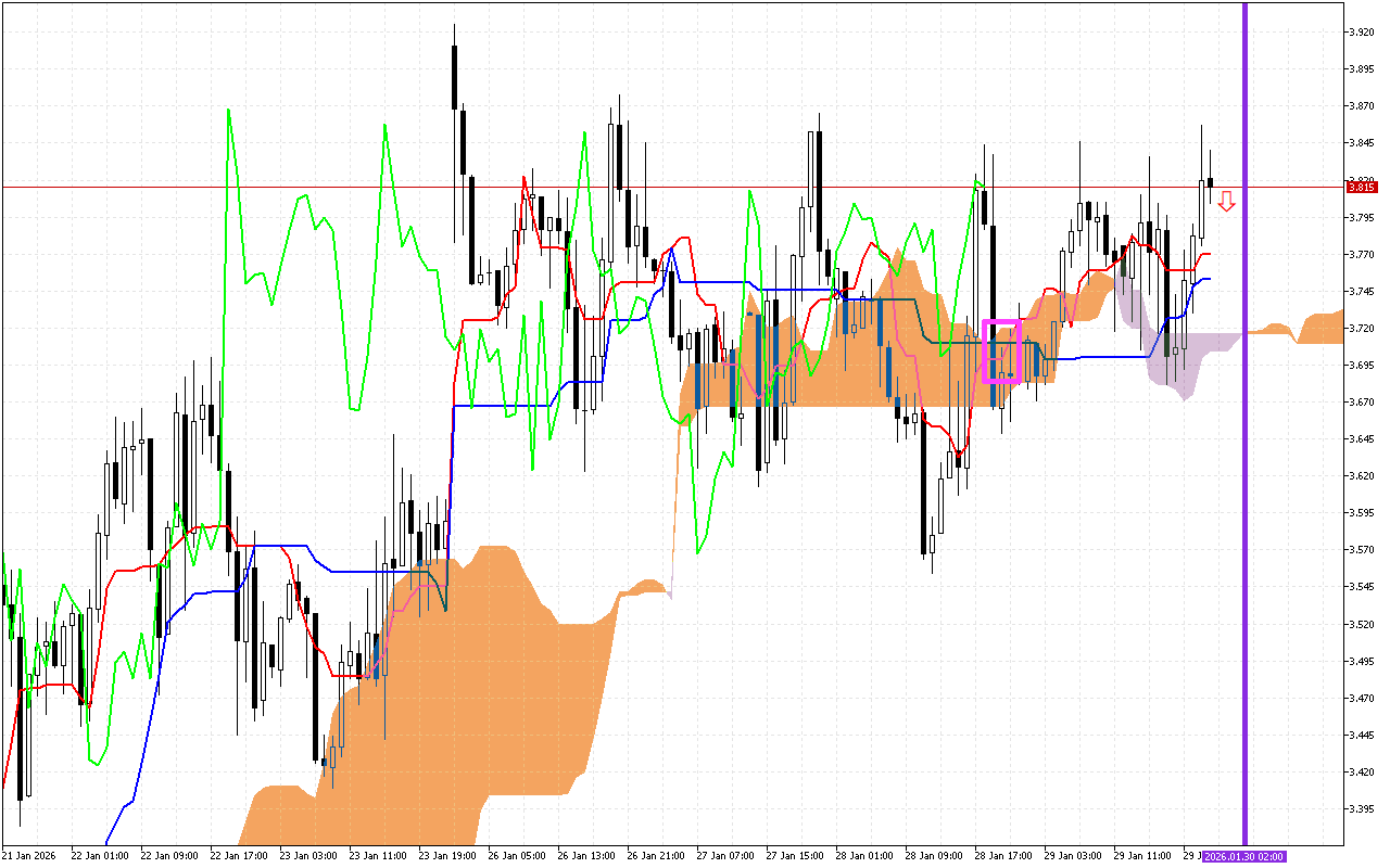 ሁለተኛው አስፈላጊ ምልክት በግራፉ ላይ ቀጥ ያለ ሐምራዊ መስመር ያለበት የKumo ደመና ቀለም ለውጥ ነው። በደመና ውስጥ የሊላክስ ቀለም መታየት ወደ ታች የመንቀሳቀስ ቅድሚያ የሚሰጠውን ለውጥ ያሳያል።