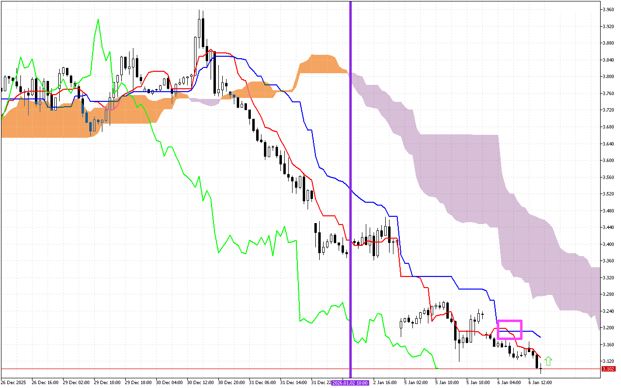 በቀደሙት የግብይት ክፍለ ጊዜዎች የተገነባው የገበያ ሁኔታ ትንተና የTenkan እና Kijun መስመሮች መገናኛን ያሳያል። በተለምዶ፣ ይህ ምልክት መጪ ጭማሪን ያሳያል፣ ነገር ግን ከዚያ በኋላ ዋጋው ከTenkan መስመር በታች ወድቋል።