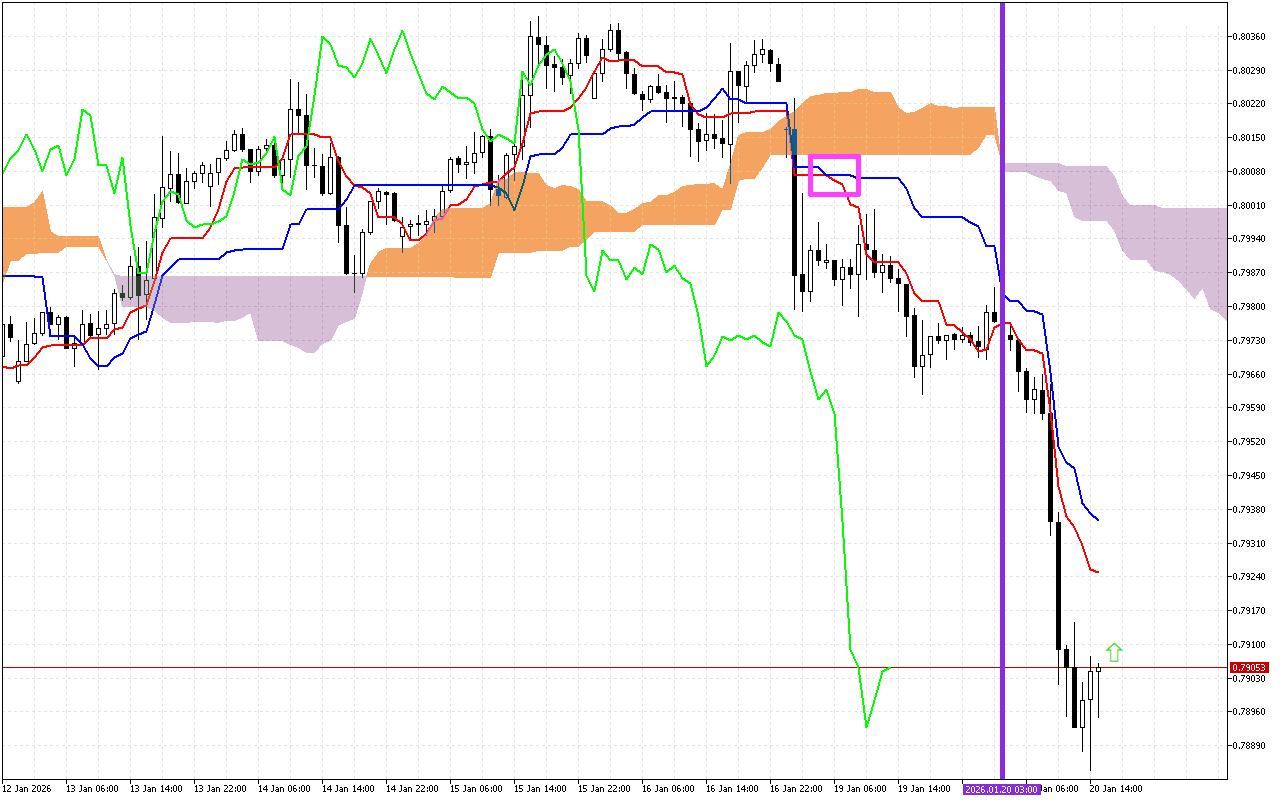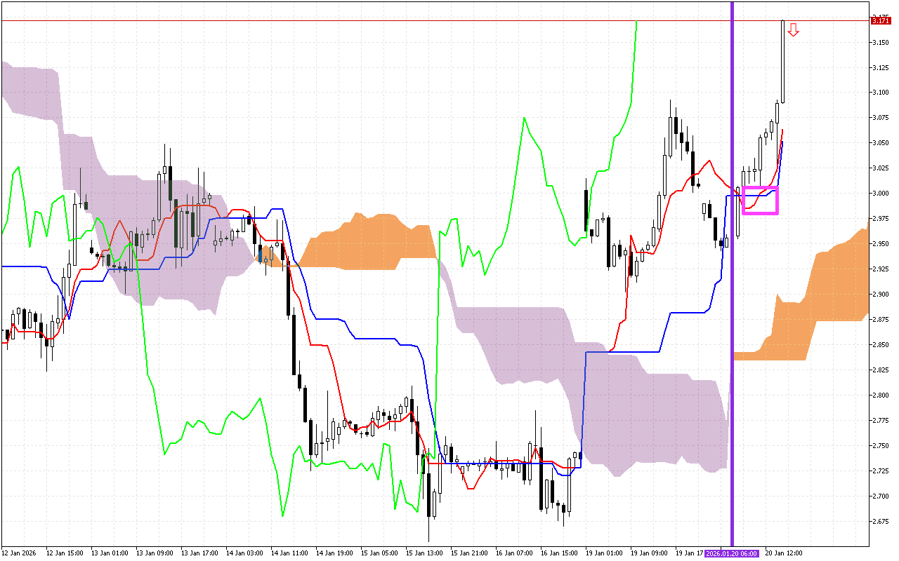 ሁለተኛው በጣም አስፈላጊ ምልክት የዳመና እንቅስቃሴ አቅጣጫ ለውጥ ነው Kumo። ይህ ምልክት በገበታው ላይ ቀጥ ያለ ሐምራዊ መስመር ምልክት ተደርጎበታል። የደመናው ብርቱካናማ ቀለም የሚያመለክተው ወደ ላይ የሚወስደው የቅድሚያ አቅጣጫ ለውጥ ነው።