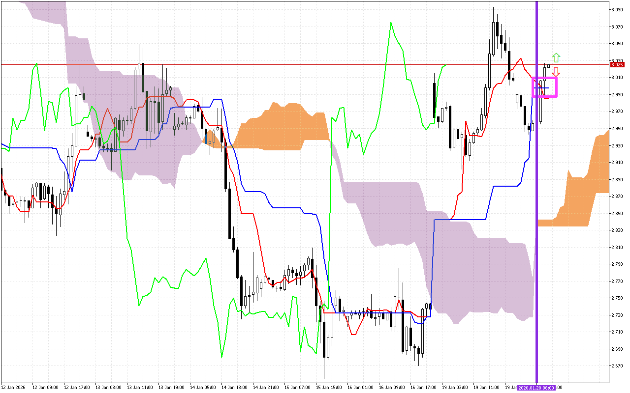 ሁለተኛው በጣም አስፈላጊ ምልክት የዳመና እንቅስቃሴ አቅጣጫ ለውጥ ነው Kumo። ይህ ምልክት በገበታው ላይ ቀጥ ያለ ሐምራዊ መስመር ምልክት ተደርጎበታል። የደመናው ብርቱካናማ ቀለም የሚያመለክተው ወደ ላይ የሚወስደው የቅድሚያ አቅጣጫ ለውጥ ነው።