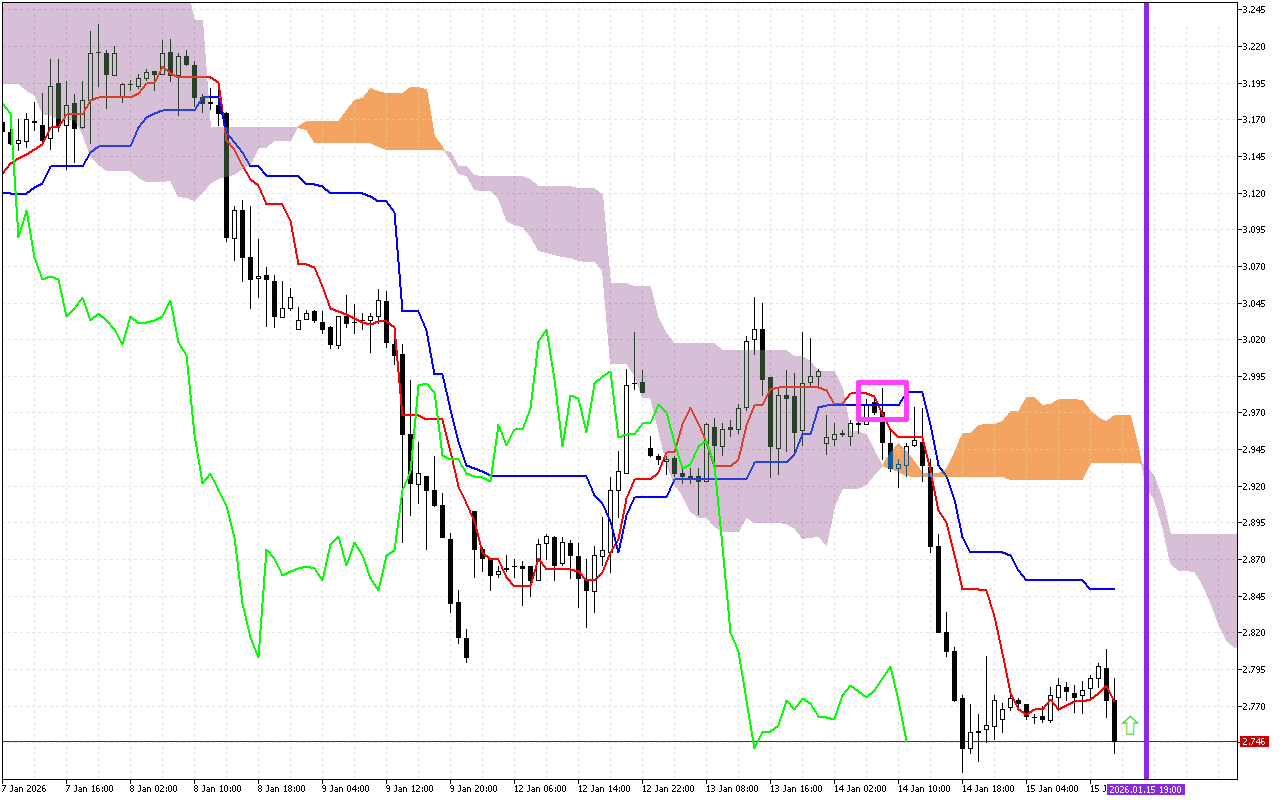 የአዝማሚያ ለውጥን ለመለየት በባለሀብቶች ጥቅም ላይ የዋለ፣ አረንጓዴው Chikou መስመር በገበታው ላይ ካለው ዋጋ በታች ተይዟል።