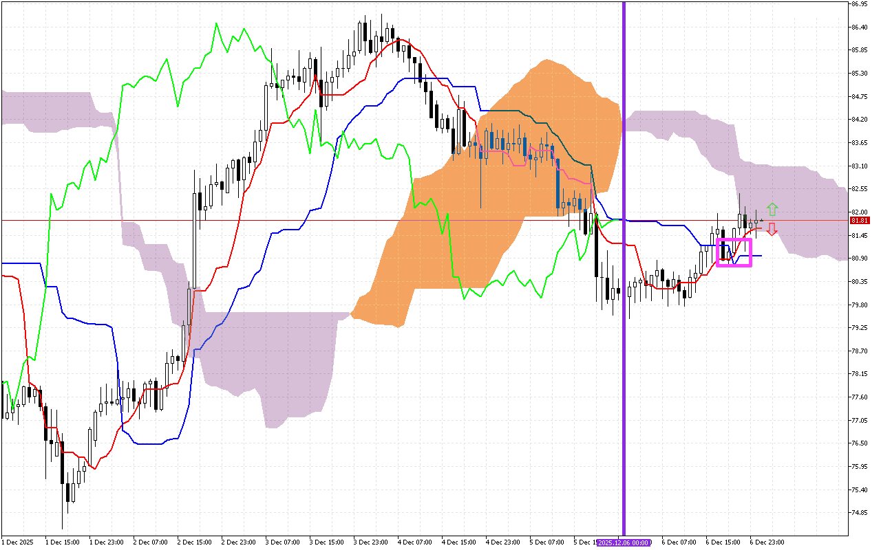 በረዥም ርቀት ላይ ያለው የዋጋ እንቅስቃሴ ተለዋዋጭነት የሚወሰነው በKumo ደመና ነው፣ እሱም አሁን ብርቱካንማ ቀለም አለው። ስለዚህ, ይህ ምልክት ለወደፊቱ የዋጋ እንቅስቃሴ ወደ ላይ ያለውን ቬክተር ቅድሚያ ይሰጣል.