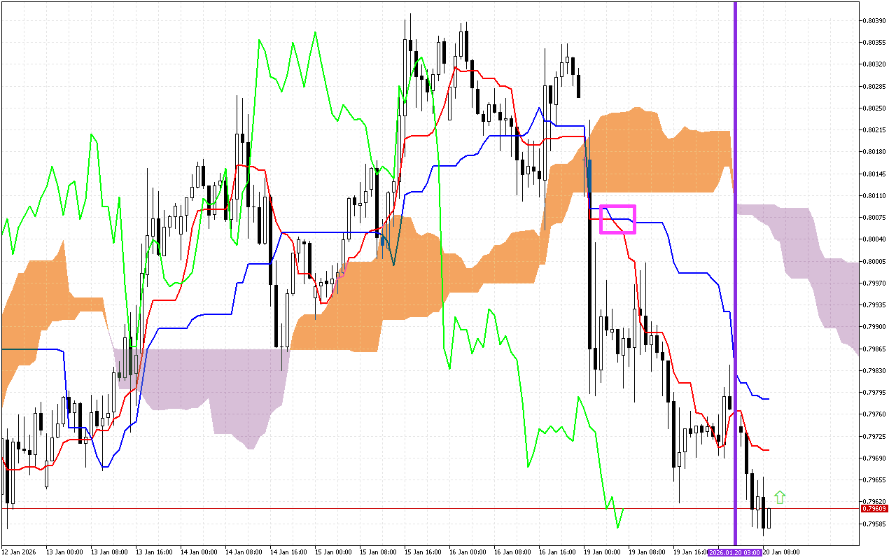 ሁለተኛው አስፈላጊ ምልክት በግራፉ ላይ ቀጥ ያለ ሐምራዊ መስመር ያለበት የKumo ደመና ቀለም ለውጥ ነው። በደመና ውስጥ የሊላክስ ቀለም መታየት ወደ ታች የመንቀሳቀስ ቅድሚያ የሚሰጠውን ለውጥ ያሳያል።