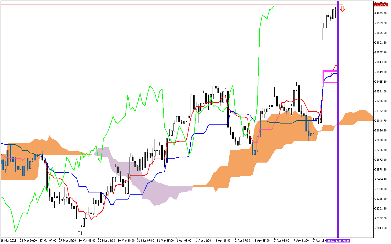 የChikou መስመር፣ የመዝጊያ ዋጋን በ26 ወቅቶች ዘግይቶ የሚያሳየው፣ አሁን ካለው ዋጋ በላይ ነው።