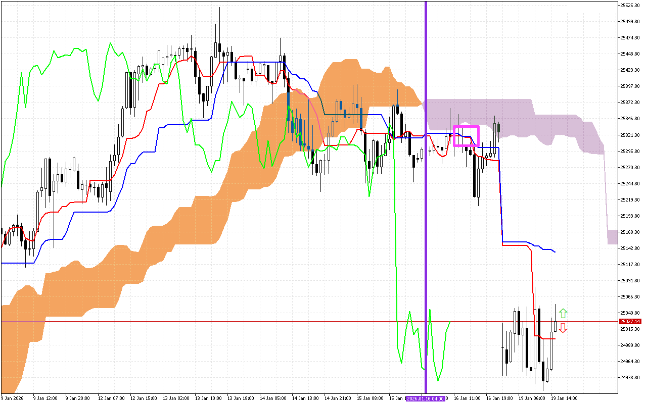 ሁለተኛው በጣም አስፈላጊ ምልክት የዳመና እንቅስቃሴ አቅጣጫ ለውጥ ነው Kumo። ይህ ምልክት በገበታው ላይ ቀጥ ያለ ሐምራዊ መስመር ምልክት ተደርጎበታል። የደመናው ብርቱካናማ ቀለም የሚያመለክተው ወደ ላይ የሚወስደው የቅድሚያ አቅጣጫ ለውጥ ነው።