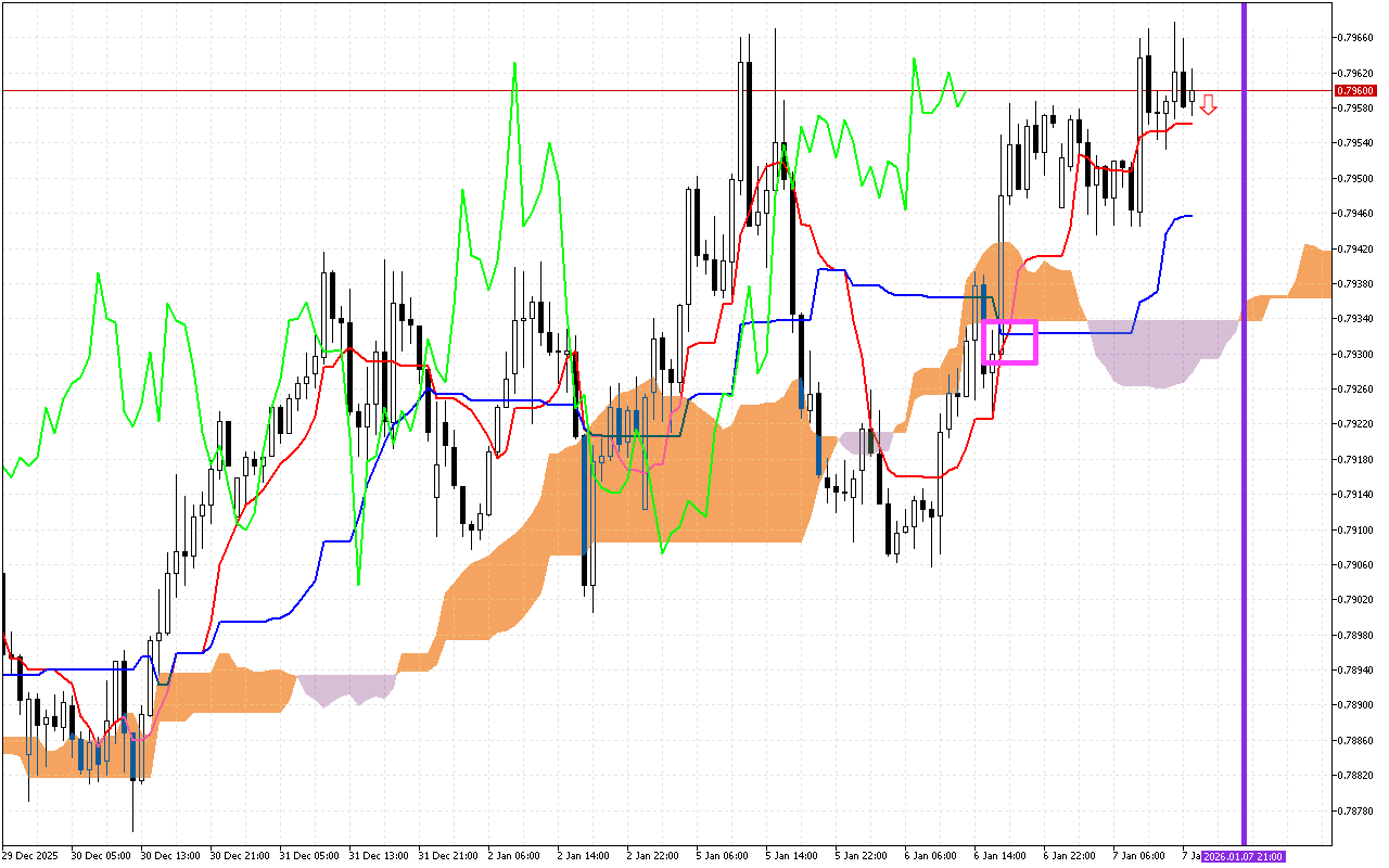 ሁለተኛው በጣም አስፈላጊው ምልክት የKumo ደመና አቅጣጫ ለውጥ ነው፣ በአቀባዊ ሐምራዊ መስመር ምልክት የተደረገበት። የደመናው ቀለም ወደ ሊilac መለወጥ የቅድሚያ እንቅስቃሴ አቅጣጫ ወደ ታች መሸጋገሩን ያሳያል።