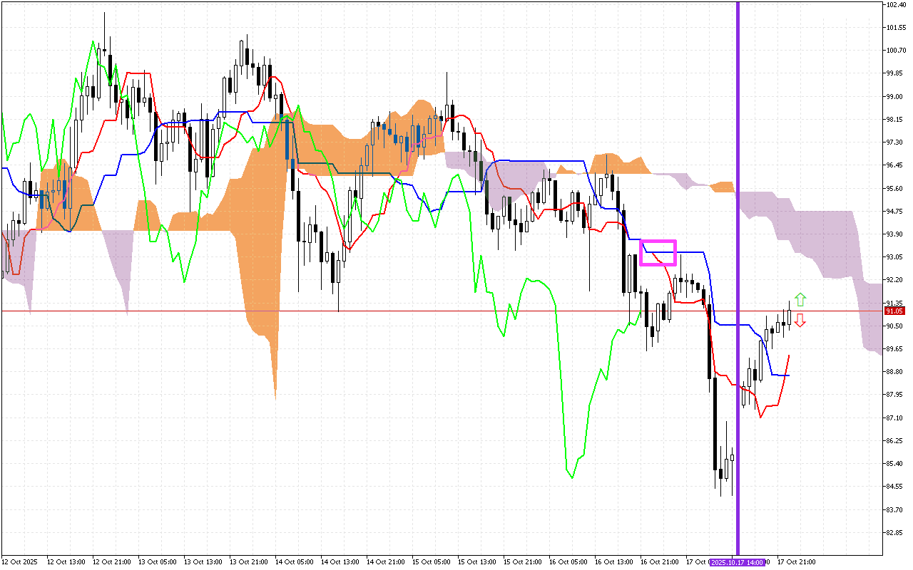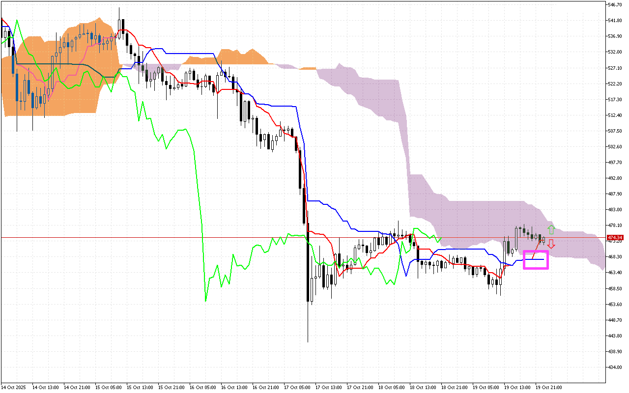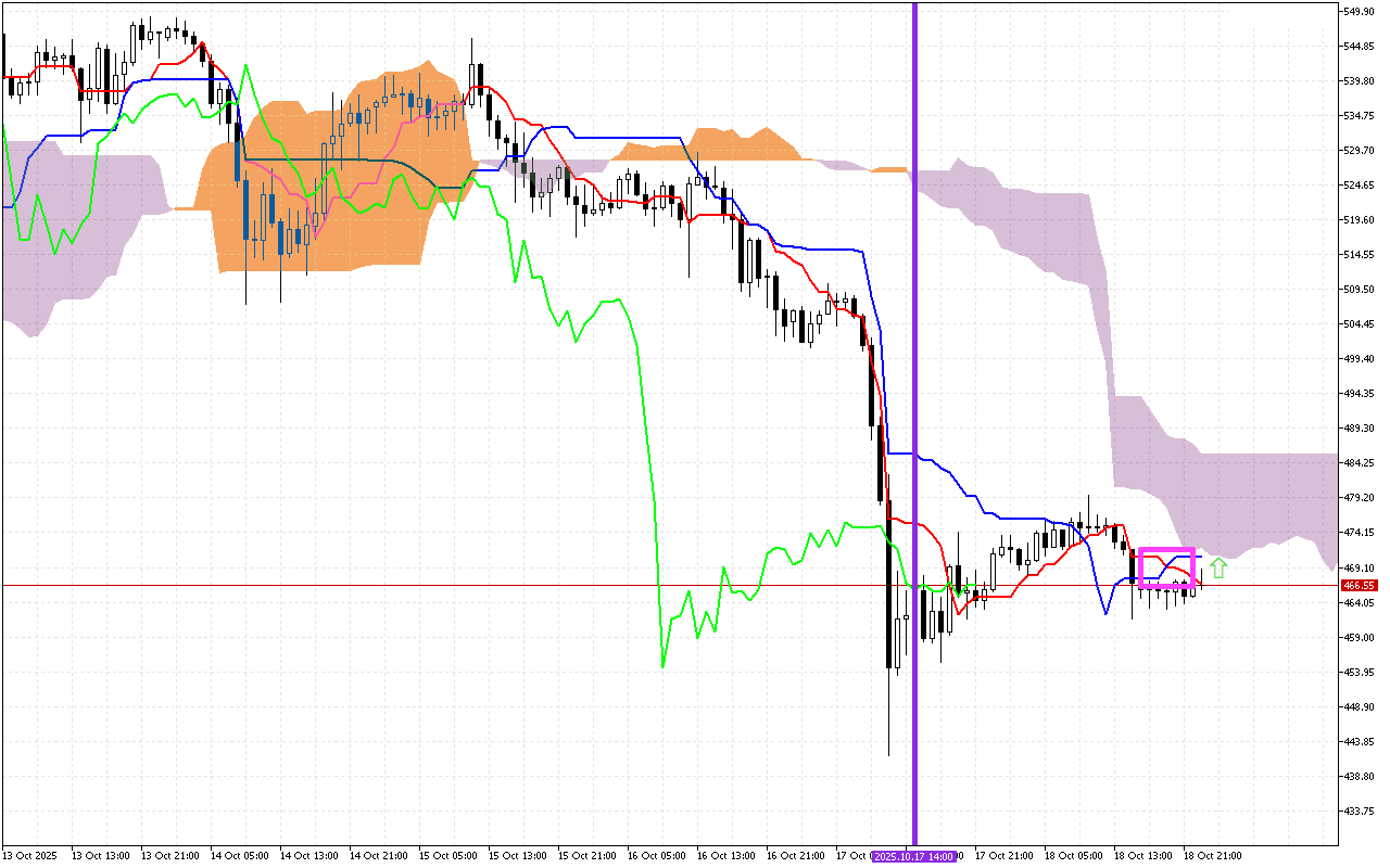 ሁለተኛው በጣም አስፈላጊው ምልክት የKumo ደመና አቅጣጫ ለውጥ ነው፣ በአቀባዊ ሐምራዊ መስመር ምልክት የተደረገበት። የደመናው ቀለም ወደ ሊilac መለወጥ የቅድሚያ እንቅስቃሴ አቅጣጫ ወደ ታች መሸጋገሩን ያሳያል።