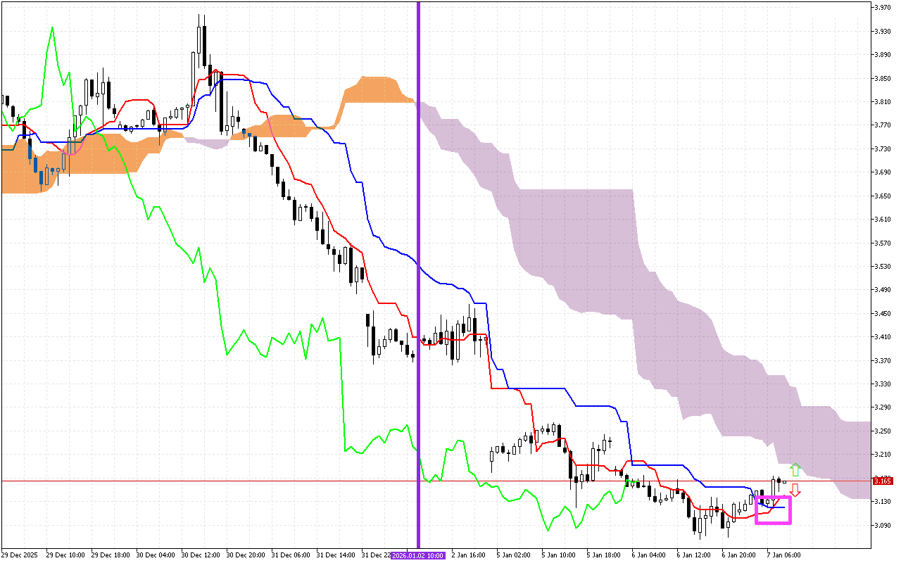 ተለዋዋጭ የድጋፍ ደረጃዎች በTenkan መስመር፣ በ3.133 ምልክት እና በKijun መስመር፣ በ3.119 ምልክት ዙሪያ ናቸው።