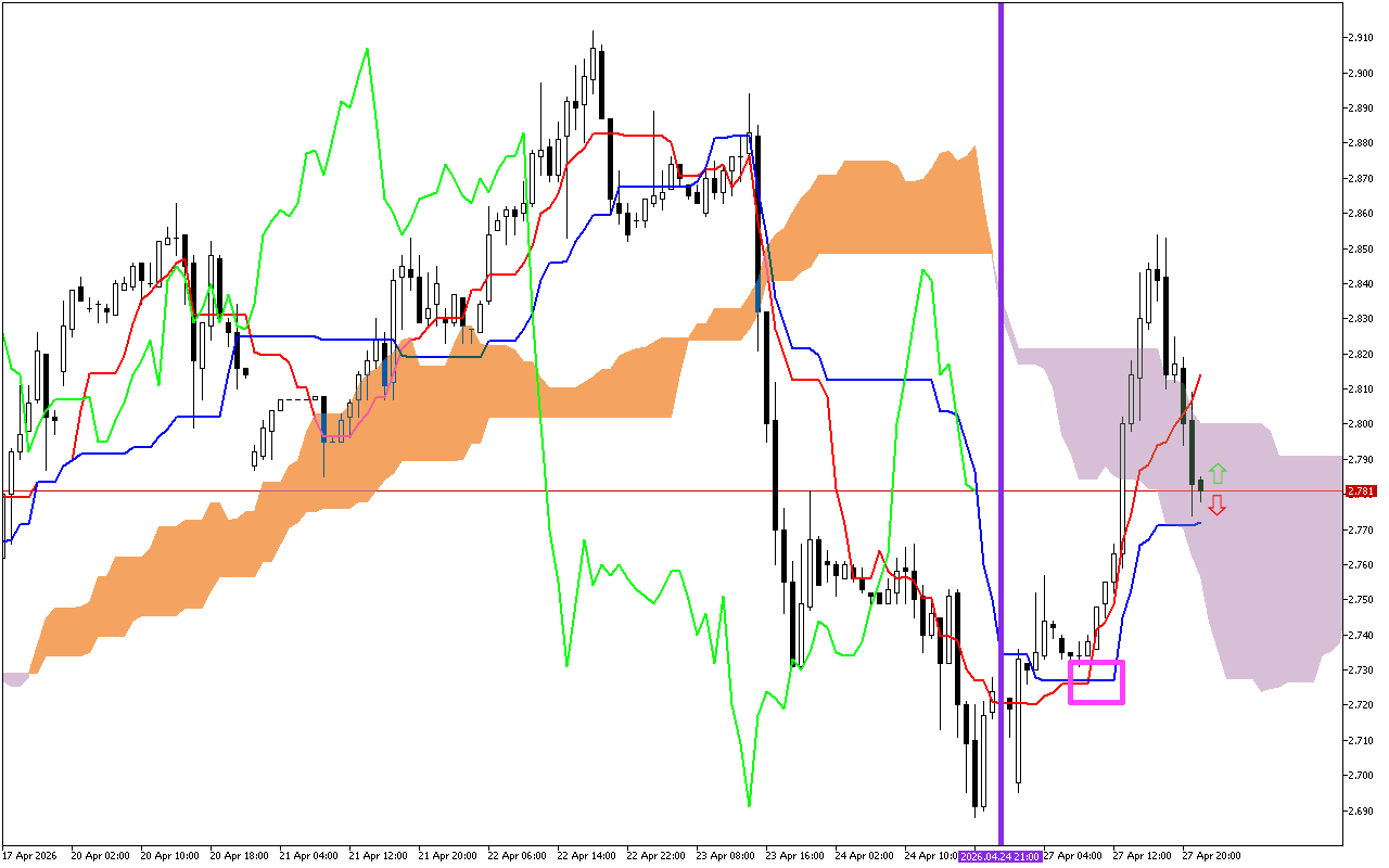 የቅርብ ጊዜ የንግድ ክፍለ ጊዜዎች ዋና ምልክት የTenkan እና Kijun መስመሮች መገናኛ ነው፣ በገበታው ላይ በሮዝ ካሬ ምልክት የተደረገበት። ይህ አሉታዊ ምልክት ነው. በመጪው አዝማሚያ ወደ ታች የመውረድ ለውጥን ያመለክታል.