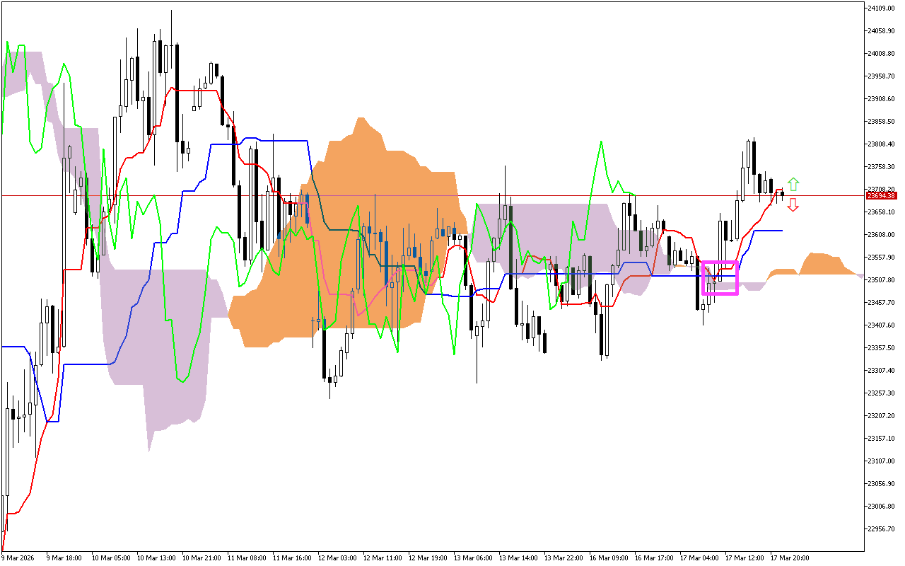 ካለፉት የንግድ ክፍለ ጊዜዎች ዋና ምልክቶች አንዱ የTenkan እና Kijun መስመሮች መገናኛ ነው። ይህ ቦታ በግራፉ ላይ ባለ ሮዝ ካሬ ምልክት ተደርጎበታል. የTenkan መስመር ከKijun መስመር በላይ መውጣቱ አዎንታዊ ምልክት ነው፣ ይህም ወደ ላይ ወደላይ ያለውን አዝማሚያ ሊያመለክት ይችላል።