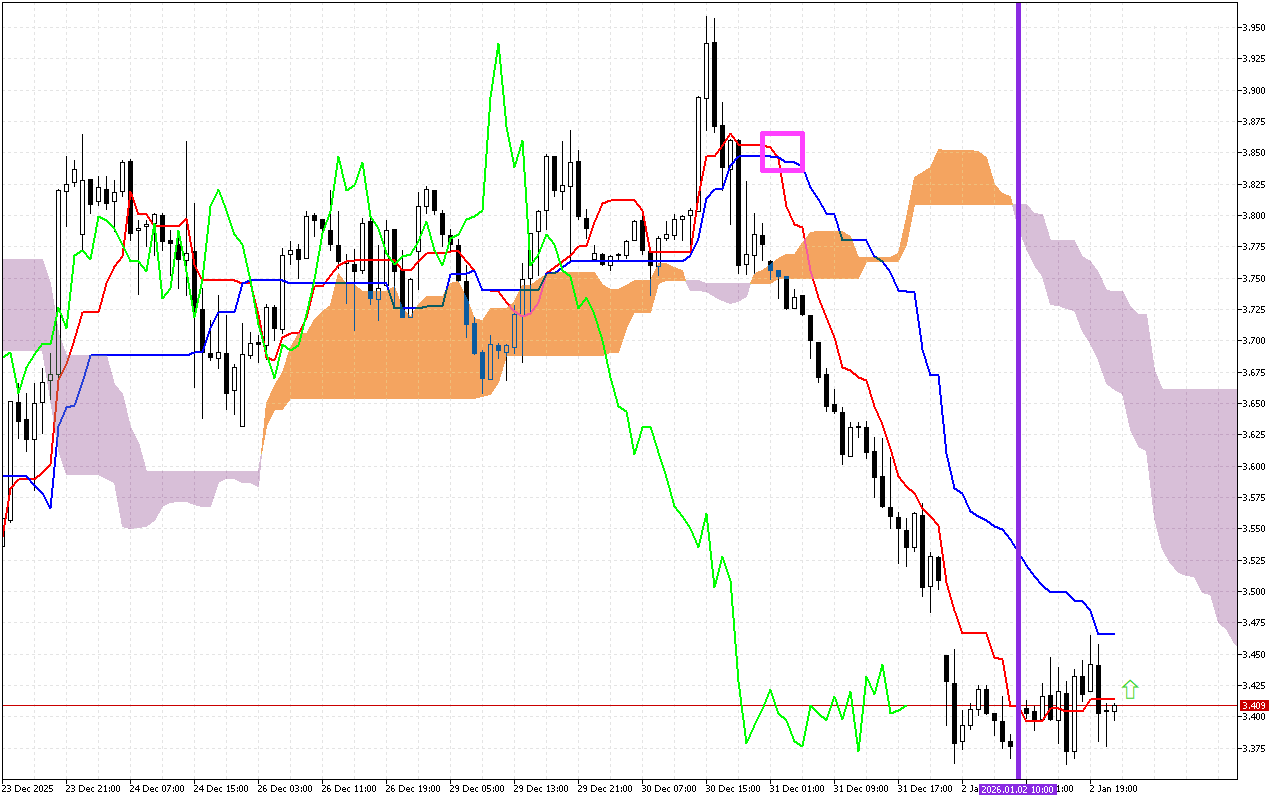 The second important signal is a change in the color of the Kumo cloud, which is marked with a vertical purple line on the graph. The appearance of a lilac color in the cloud indicates a change in the priority direction of movement to downward.