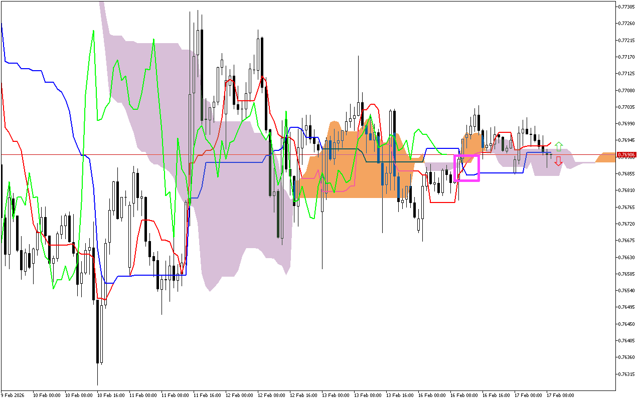 Analyzing previous trading sessions, it is worth paying attention to the intersection of the Tenkan and Kijun lines, marked with a pink square. The fast Tenkan line fell below the Kijun line, which usually signals a change in trend to a downward one. However, later the price rose above the Tenkan line, which indicates the weakness of the downward impulse.