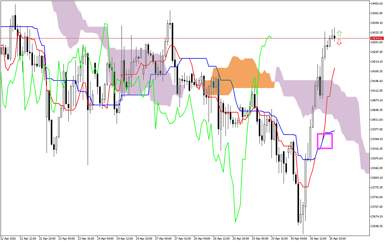 Dynamic support levels are seen at the Tenkan line near 24154.54, the Kijun line around 23970.10, the SenkouA line near 24030.87, and the SenkouB line around 24148.19.