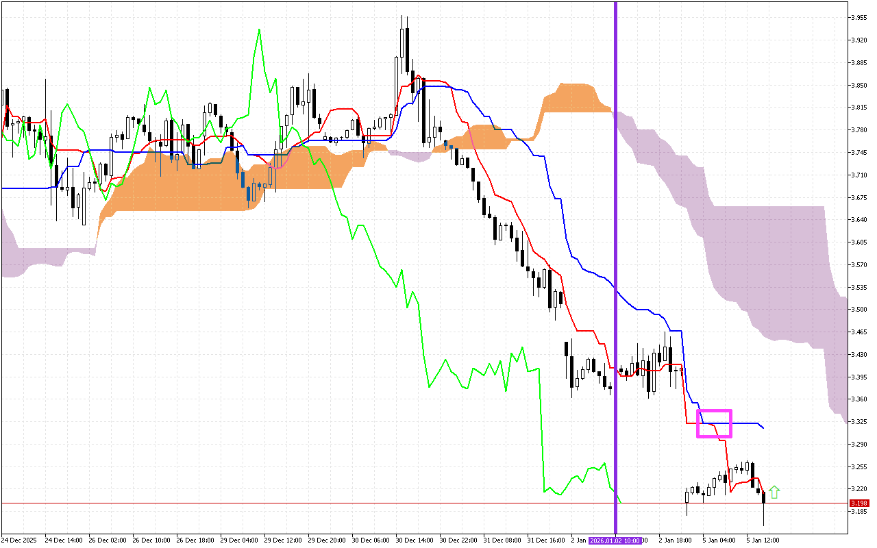 In the current market profile, the price has fixed below the Kumo cloud. The boundaries of the cloud form a dynamic resistance zone for the price.