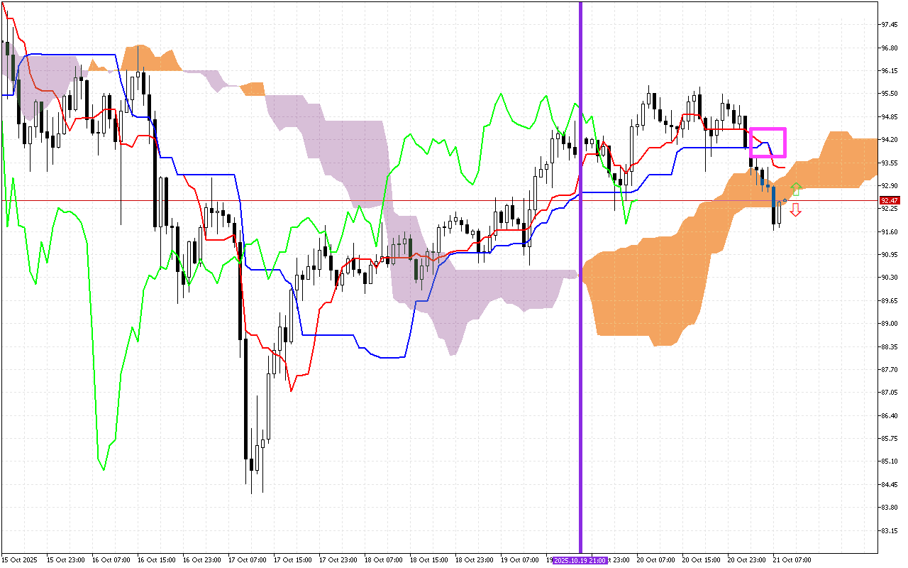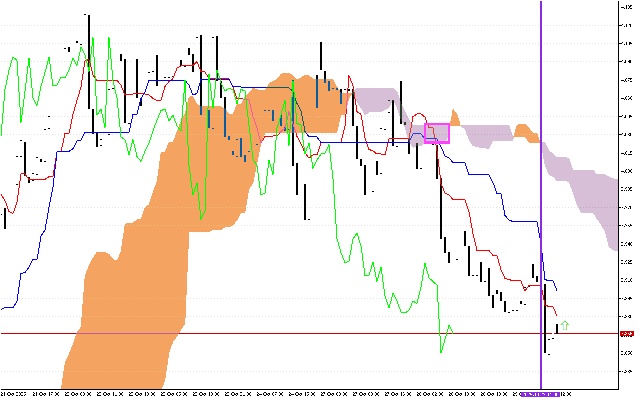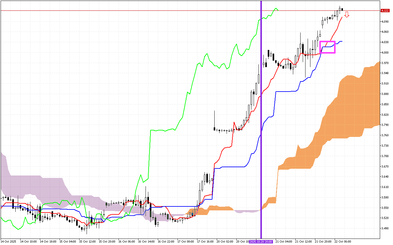 The second important signal is a change in the color of the Kumo cloud, which is marked with a vertical purple line on the graph. The appearance of a lilac color in the cloud indicates a change in the priority direction of movement to downward.