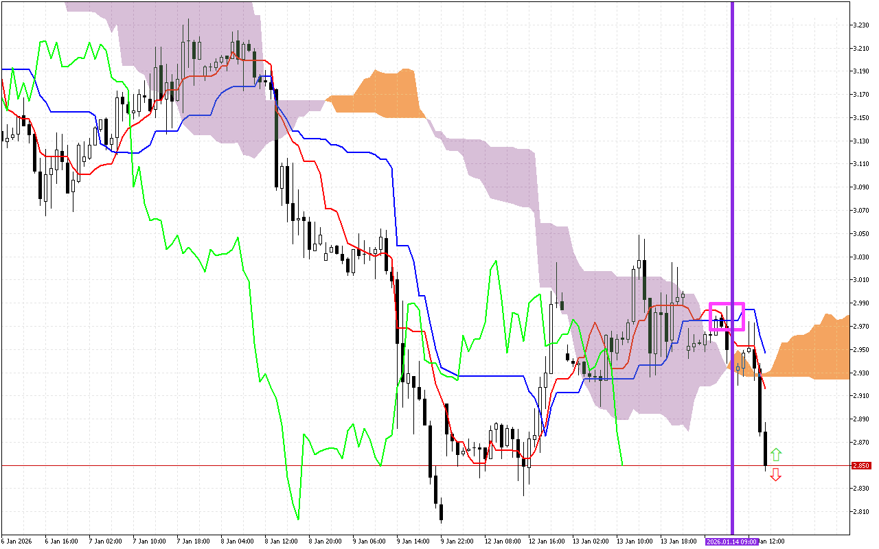 In the current market profile, the price has fixed below the Kumo cloud. The boundaries of the cloud form a dynamic resistance zone for the price.