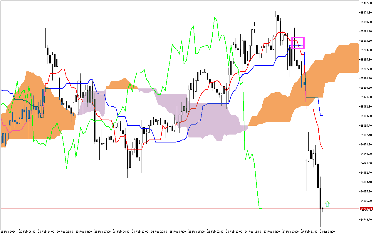 The second important signal is a change in the direction of movement of the Kumo cloud. This change is marked with a vertical purple line on the chart. The appearance of orange color in the cloud indicates a change in the main direction of movement to upward.