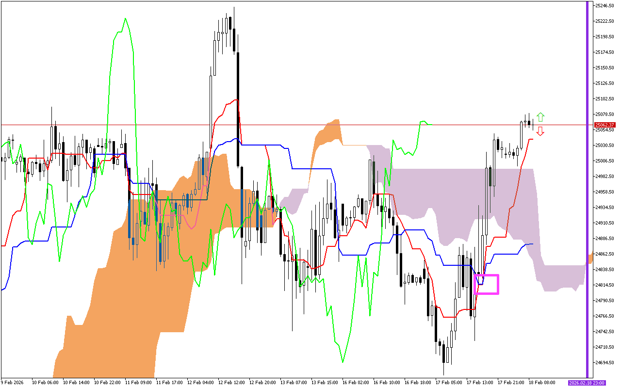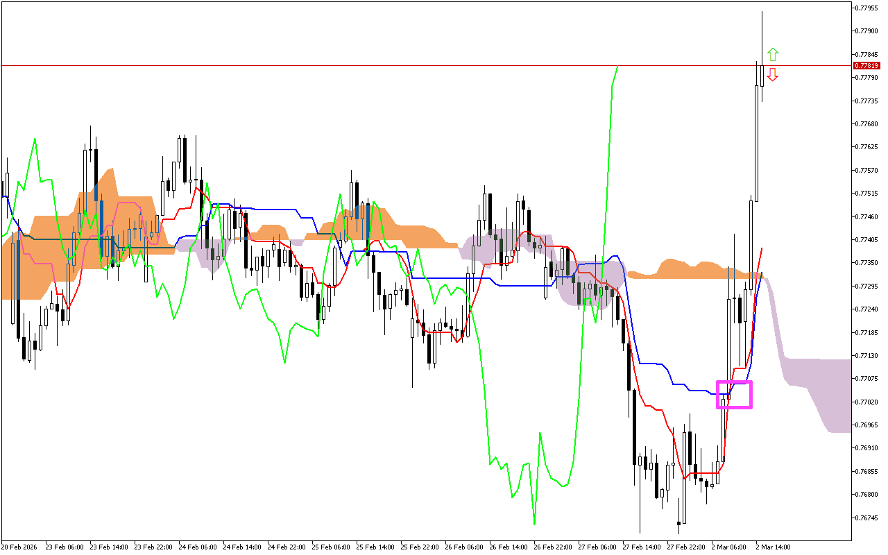 The second most important signal is a change in the direction of movement of the cloud Kumo. This signal is marked on the chart with a vertical purple line. The orange color of the cloud indicates a change in the priority direction of movement to upward.
