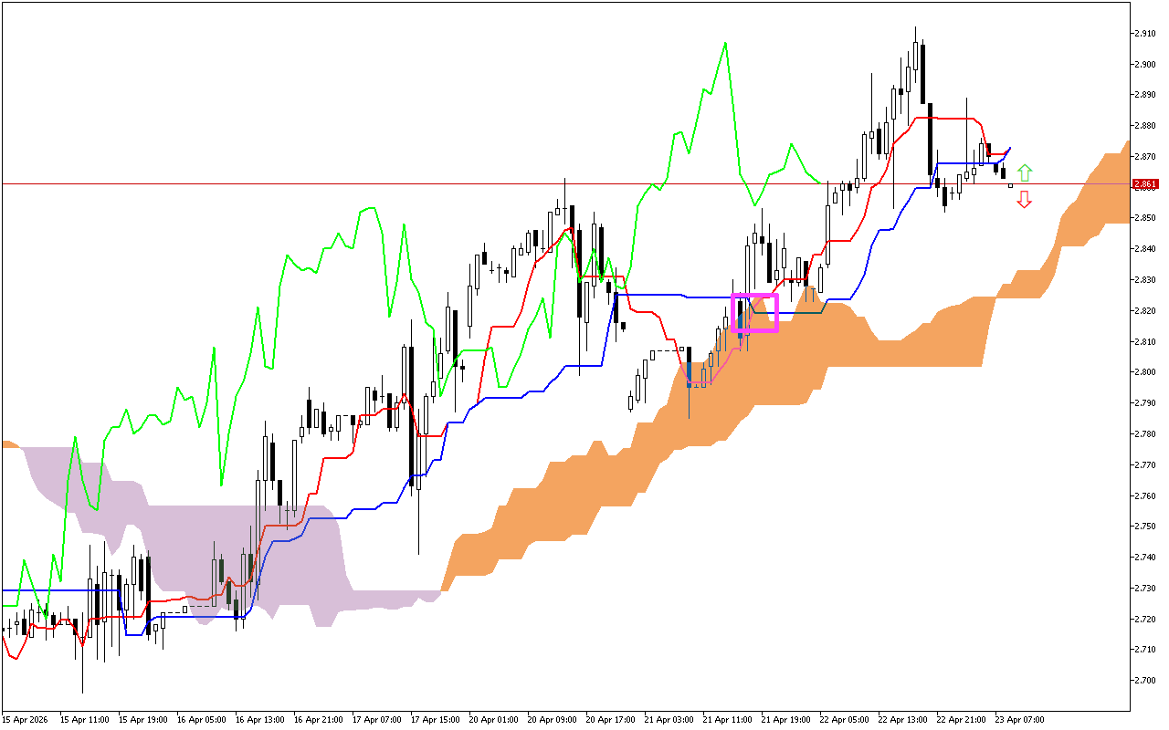 Dynamic support levels are located on the Kijun line, near the 2.869, the SenkouA line, at the 2.829, and the SenkouB line, near the 2.824.