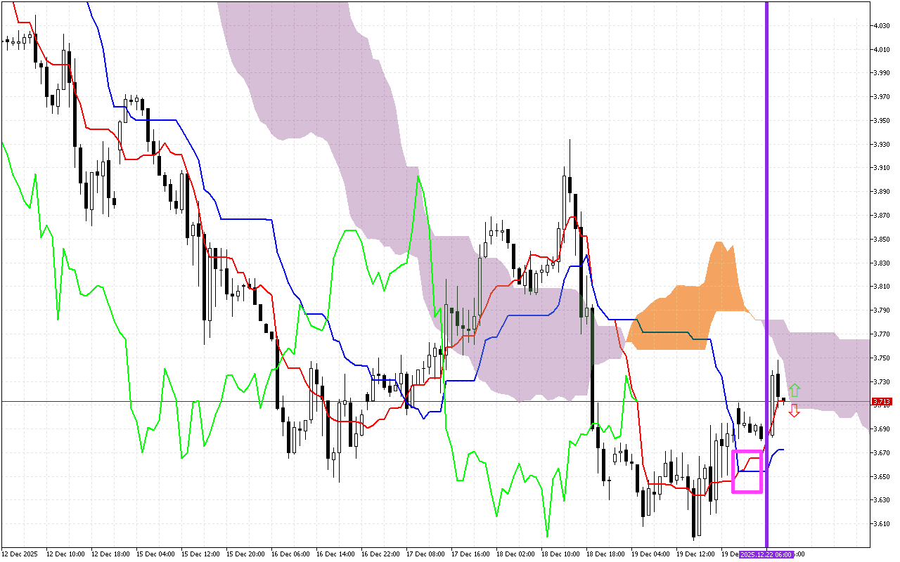Analysis of the market situation, developed in previous trading sessions, shows the intersection of the Tenkan and Kijun lines. Typically, this signal indicates an upcoming increase, but subsequently the price fell below the Tenkan line.