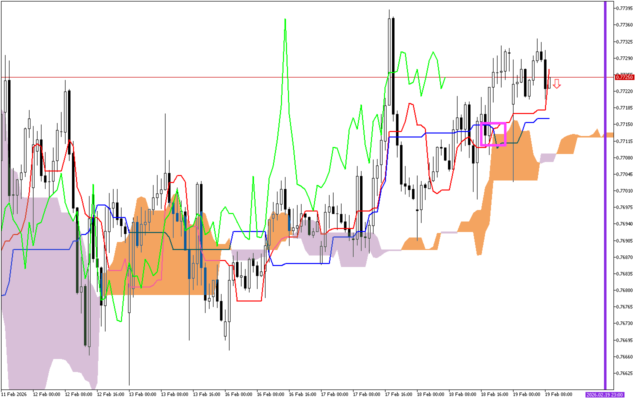 Dynamic support levels are seen at the Tenkan line near 0.78104, the Kijun line around 0.77938, the SenkouA line near 0.77743, and the SenkouB line around 0.77861.