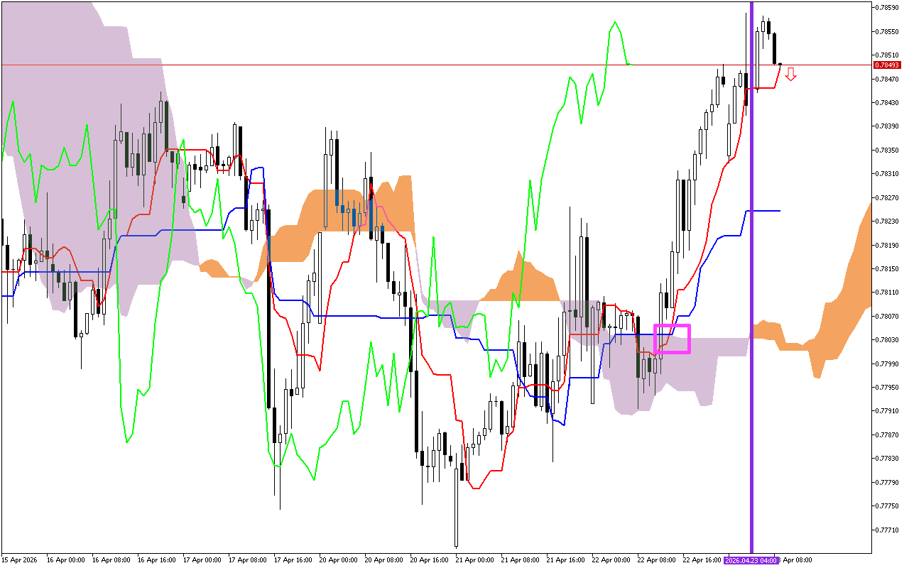 Dynamic support levels are seen at the Tenkan line near 0.78455, the Kijun line around 0.78248, the SenkouA line near 0.78059, and the SenkouB line around 0.78030.