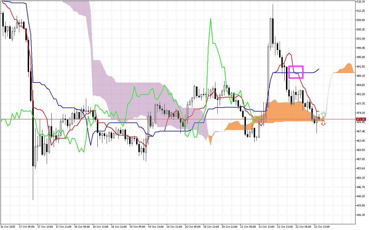 Babban lokacin zaman ciniki na baya shine mahadar layin Tenkan da Kijun. Ana yiwa wannan siginar alama akan ginshiƙi tare da murabba’in ruwan hoda kuma yana nuna canji a yanayin zuwa ƙasa. Koyaya, daga baya an lura cewa farashin ya tashi sama da layin Tenkan, yana nuna rauni a cikin saurin ƙasa.