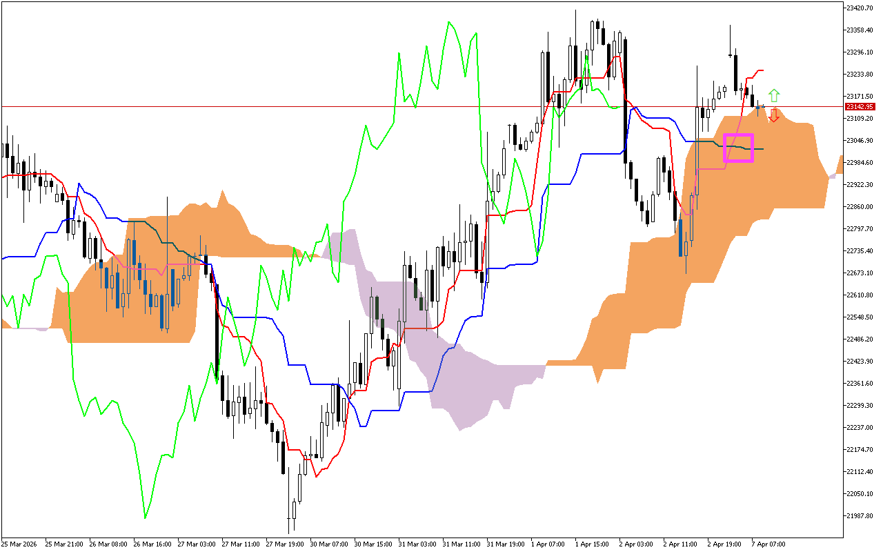 Babban siginar sabbin zaman ciniki shine mahadar layin Tenkan da Kijun, masu alama akan ginshiƙi tare da murabba’in ruwan hoda. Wannan sigina mara kyau. Yana nuna canji a yanayin da ke zuwa zuwa ƙasa.