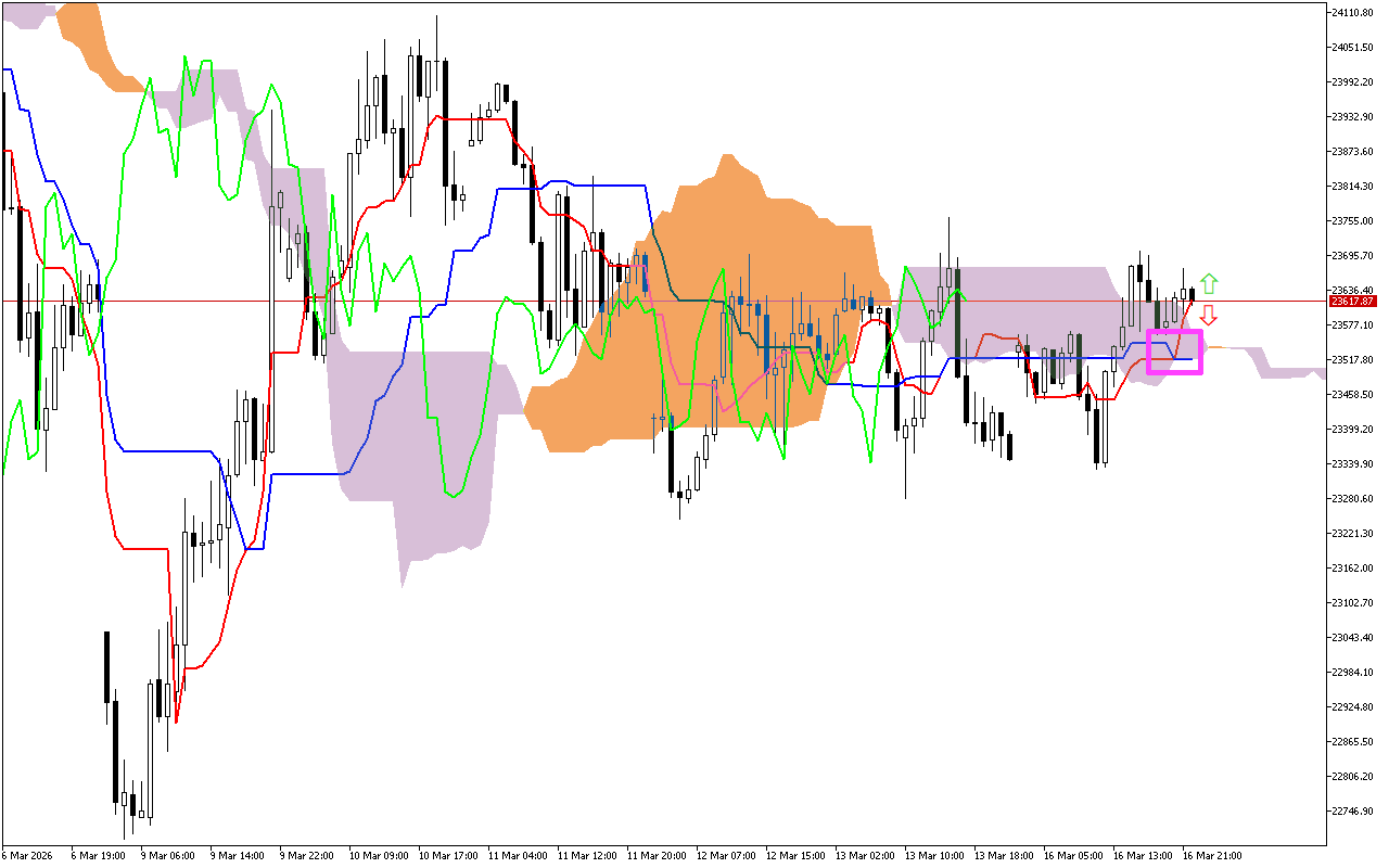 Matakan tallafi masu ƙarfi suna kan layin Tenkan, a kusa da alamar 23586.62, layin Kijun, kewaye da alamar 23516.37, SenkouA layi, a alamar 23519.60, da layin SenkouB, a kusa da alamar 23602.83.