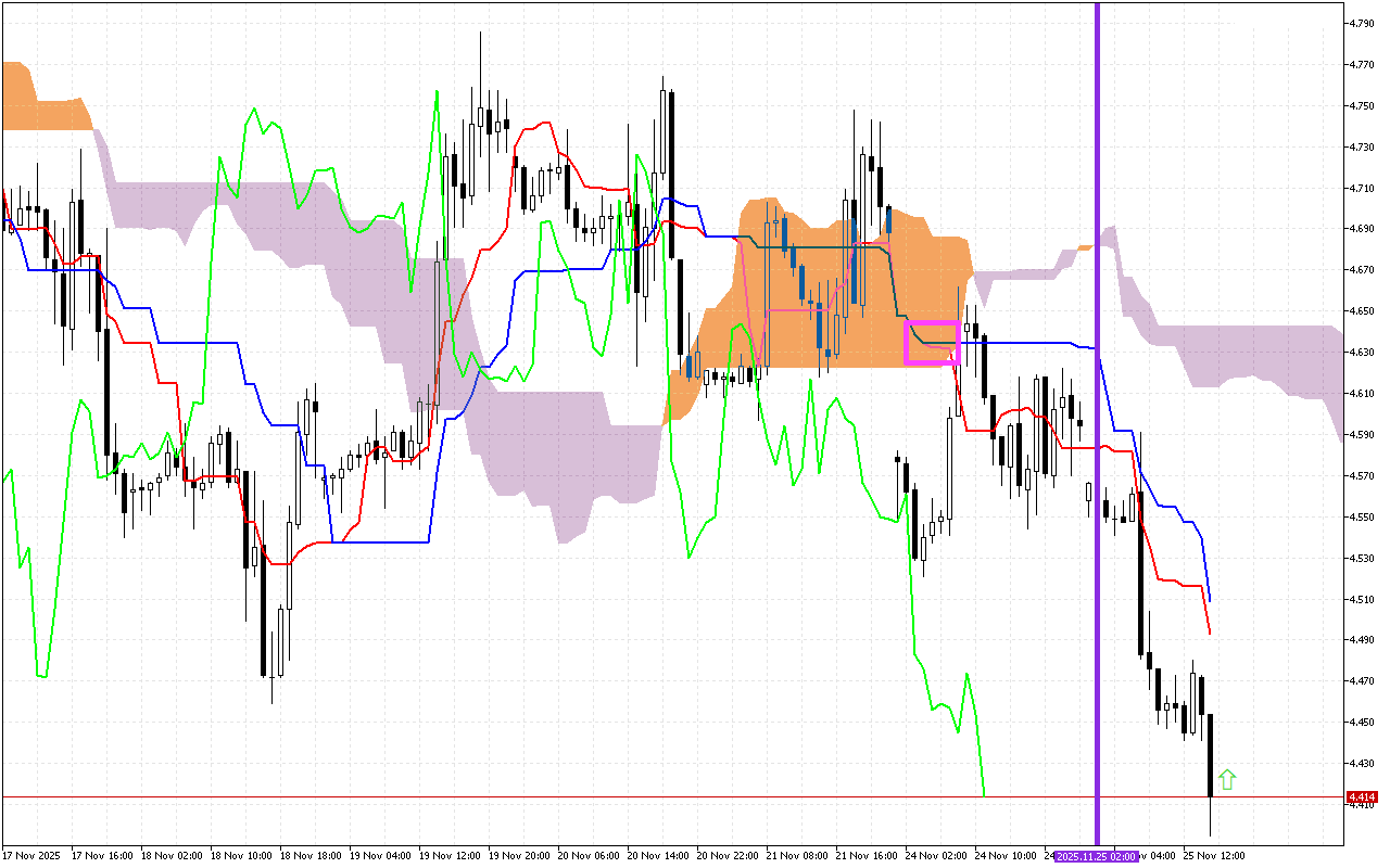 Sigina mai mahimmanci na biyu shine canji a cikin alkiblar motsi na gajimare Kumo. Ana yiwa wannan canjin alama da layin shuɗi na tsaye akan ginshiƙi. Bayyanar launin lemu a cikin gajimare yana nuna canji a cikin babbar hanyar motsi zuwa sama.