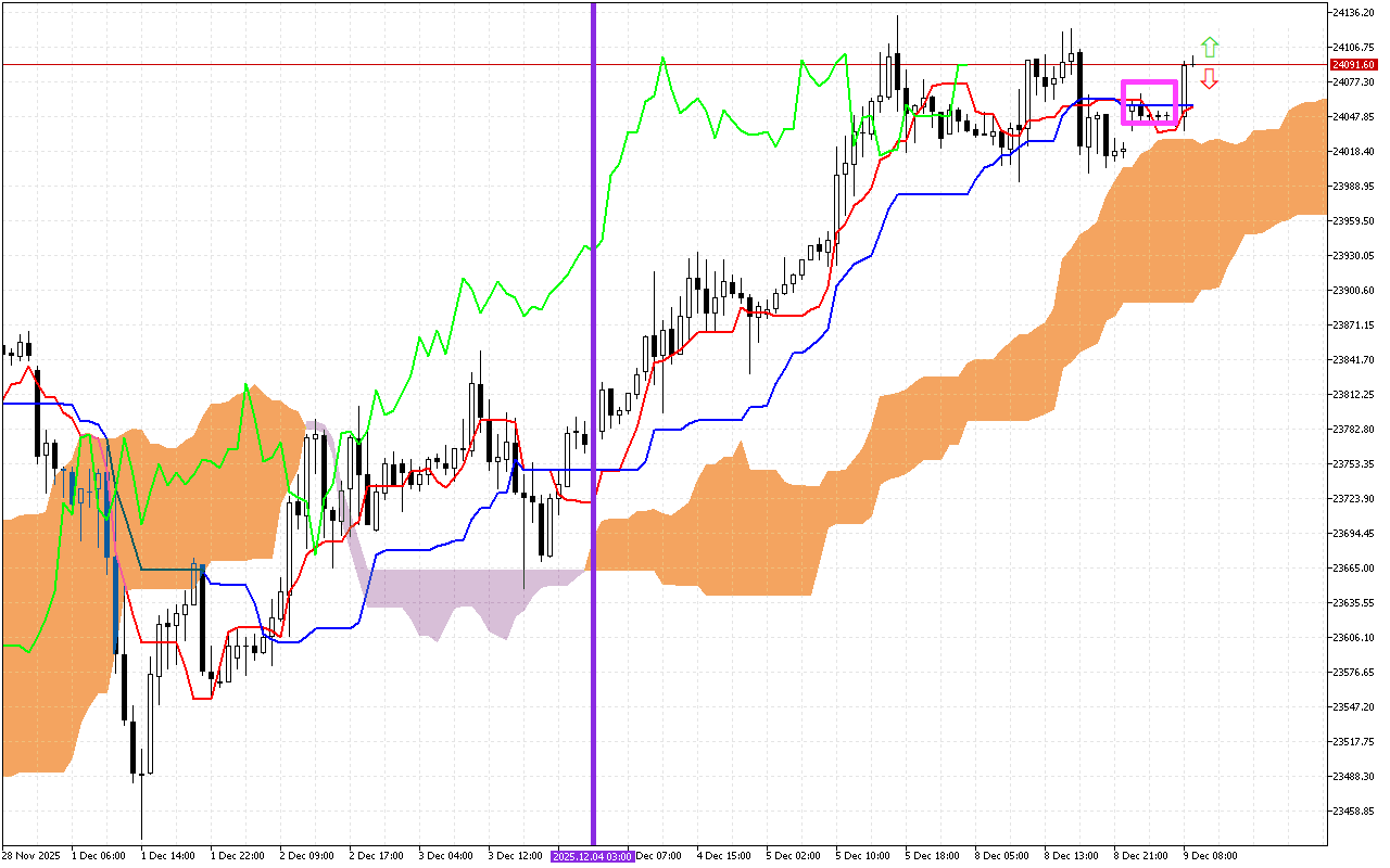 Ɗaya daga cikin manyan sigina na zaman ciniki da ya gabata shine mahadar layin Tenkan da Kijun, Wannan yanki an yi masa alama da murabba’in ruwan hoda akan jadawali. Yunƙurin layin Tenkan sama da layin Kijun sigina ce mai kyau, wanda zai iya nuna yiwuwar sauyi a yanayin zuwa sama.