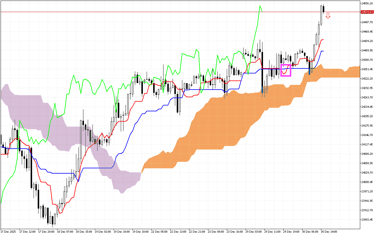 Layin Chikou, wanda ke nuna farashin rufewa tare da jinkirin lokuta 26, ya fi farashin yanzu.