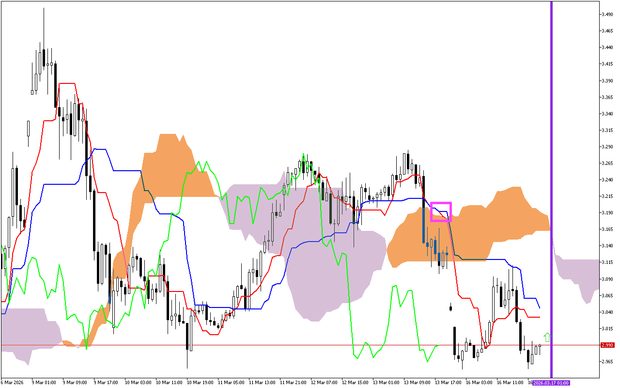 Ana ganin sigina na layi uku akan taswirar Natural Gas. Farashin yana ƙasa da layin ja Tenkan, layin Kijun shuɗi, da gajimare Kumo. Wannan sigina yana nuna ƙarin haɓakar motsin ƙasa.