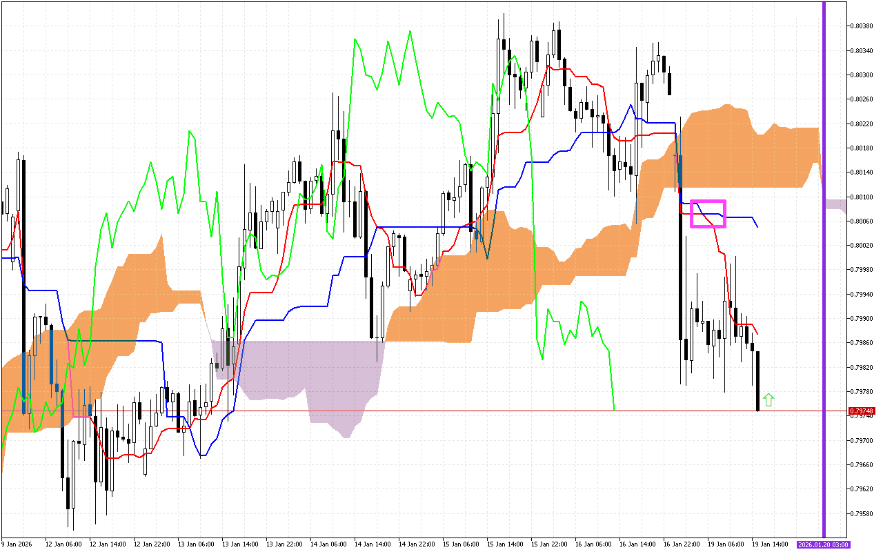 Sigina mai mahimmanci na biyu shine canjin launi na gajimare Kumo, wanda aka yiwa alama da layin shunayya a tsaye akan jadawali. Bayyanar launin lilac a cikin gajimare yana nuna canji a cikin fifikon jagorar motsi zuwa ƙasa.