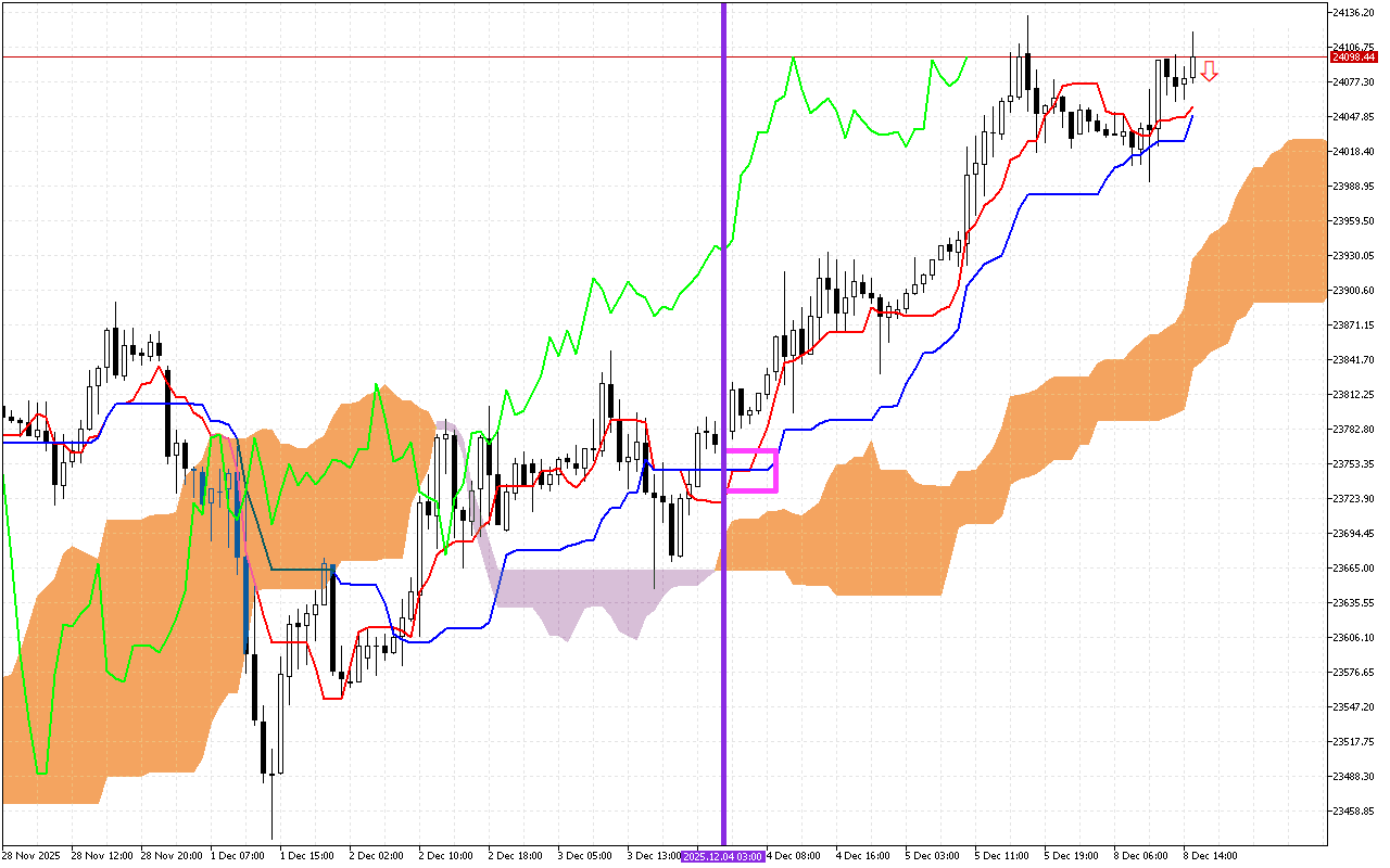 Sadarkaaleen deeggarsa daayinamikii sarara Tenkan irratti, naannoo mallattoo 24046.60, sarara Kijun, naannoo mallattoo 24027.76, sarara SenkouA, mallattoo 23885.28 irratti, fi sarara SenkouB, naannoo 23799.03 mallattoo.