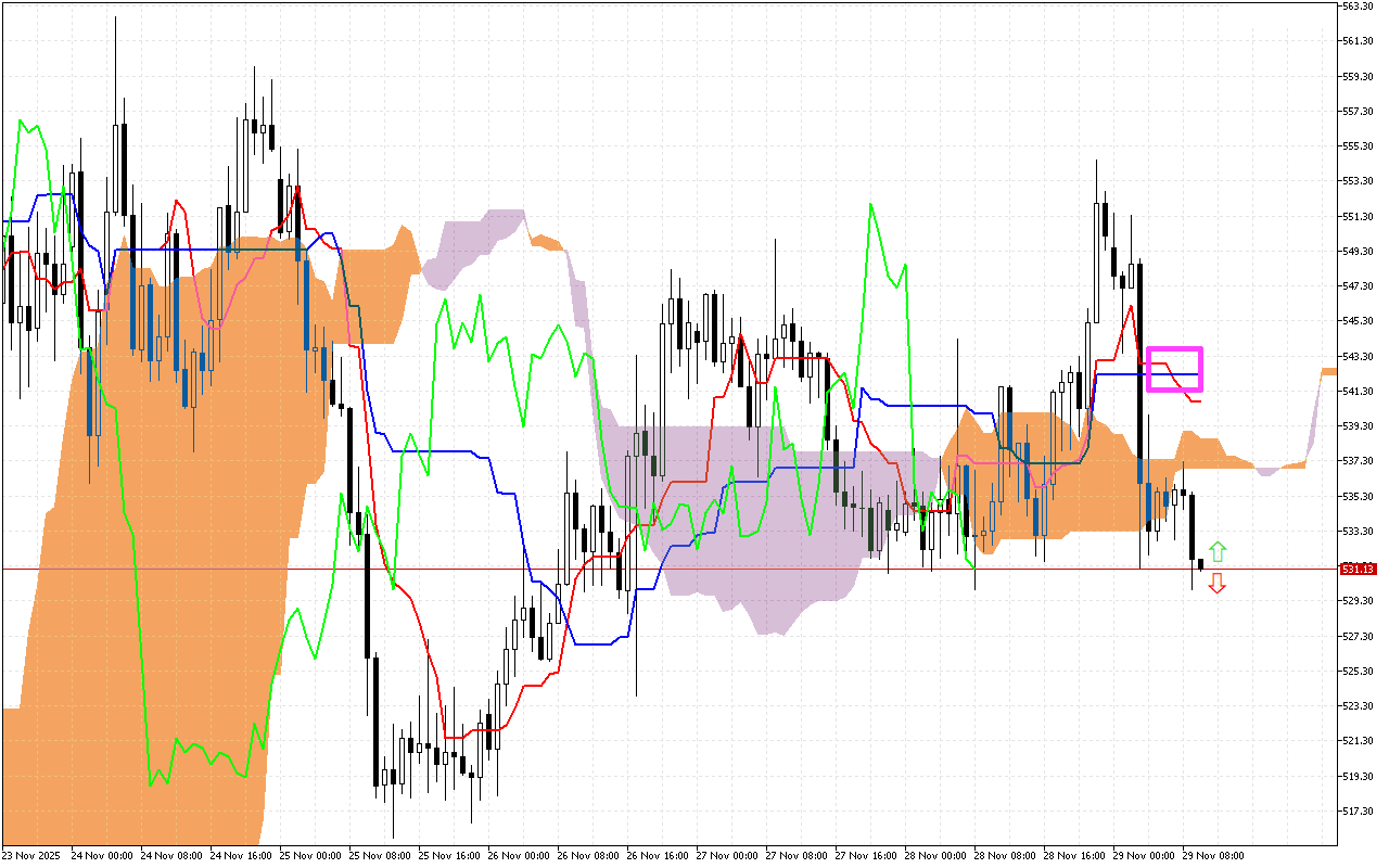 Gatiin kun duumessa Kumo keessa jira, kunis marsaa mirkanaa’uu dhabuu gabaa agarsiisa. Sararoonni SenkouA fi SenkouB akka deeggarsa fi diddaatti hojjetu.