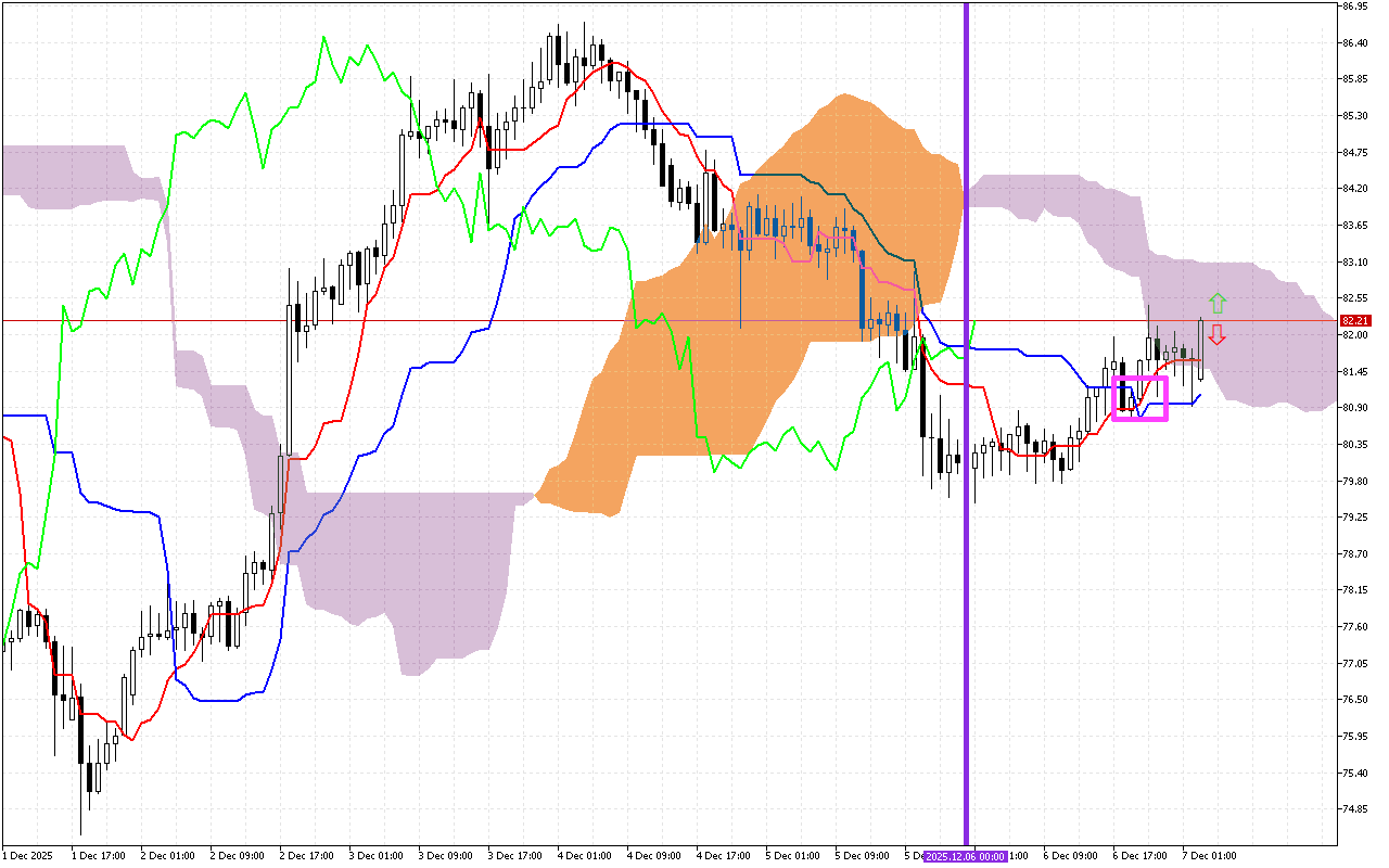 Sadarkaan deeggarsa daayinamikii sarara Tenkan irratti, naannoo mallattoo 81.60, sarara Kijun, naannoo mallattoo 80.95, fi sarara SenkouB, mallattoo83.13 irratti argama.
