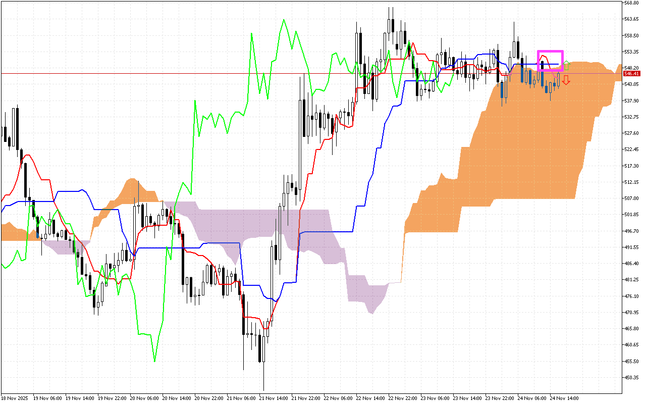 Mallattoolee agarsiiftuu Ichimoku ol’aantummaa miira gaarii gabaa agarsiisu, kanaaf guyyaa sana keessatti sadarkaa deeggarsa armaan olitti agarsiifame irraa bakka seensaa iddoo dheeraa barbaaduuf filannoo kennamuu qaba.