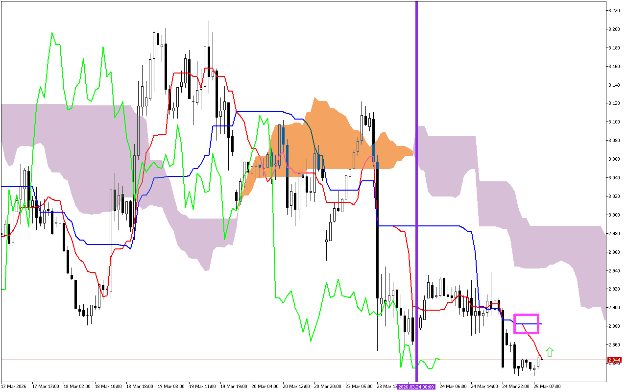 Sadarkaan deeggarsa daayinamikii sarara Tenkan irratti, naannoo mallattoo 2.769, sarara Kijun, naannoo mallattoo 2.761, fi sarara SenkouB, mallattoo2.837 irratti argama.