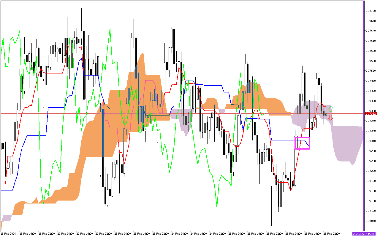 Sadarkaaleen deeggarsa daayinamikii sarara Tenkan irratti, naannoo mallattoo 0.78140, sarara Kijun, naannoo mallattoo 0.78021, sarara SenkouA, mallattoo 0.77732 irratti, fi sarara SenkouB, naannoo 0.77778 mallattoo.