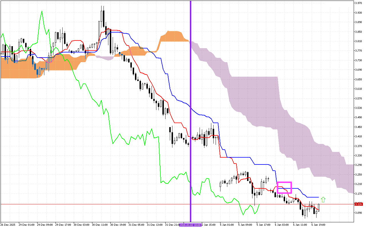 Sadarkaaleen deeggarsa daayinamikii sarara Tenkan irratti, naannoo mallattoo 0.79787, sarara Kijun, naannoo mallattoo 0.79733, sarara SenkouA, mallattoo 0.79801 irratti, fi sarara SenkouB, naannoo 0.79863 mallattoo.
