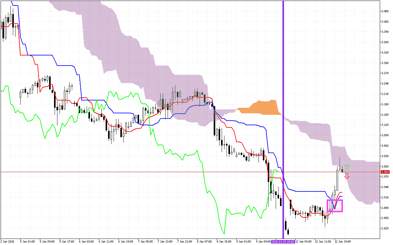 Mallattoon inni guddaan walgahii daldalaa isa haaraa walqaxxaamuraa sararoota Tenkan fi Kijun, chaartii irratti iskuweerii bifa pilaastikiitiin mallatteeffamaniidha. Kun mallattoo negaatiivii dha. Jijjiirama adeemsa dhufu gara gadi bu’uu agarsiisa.