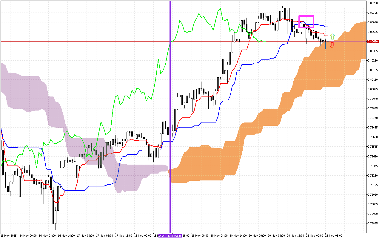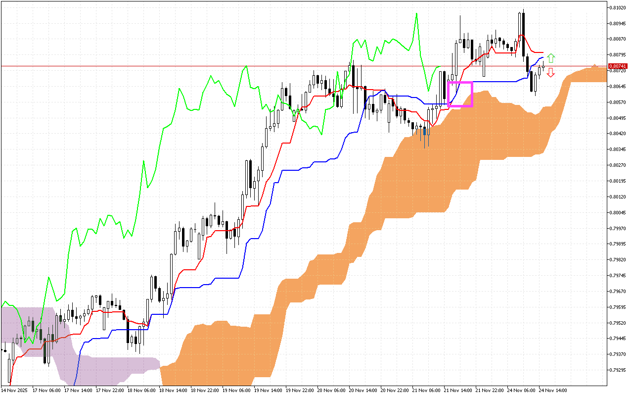 Sadarkaaleen deeggarsa daayinamikii sarara Tenkan irratti, naannoo mallattoo 0.80407, sarara Kijun, naannoo mallattoo 0.80365, sarara SenkouA, mallattoo 0.80108 irratti, fi sarara SenkouB, naannoo 0.80198 mallattoo.