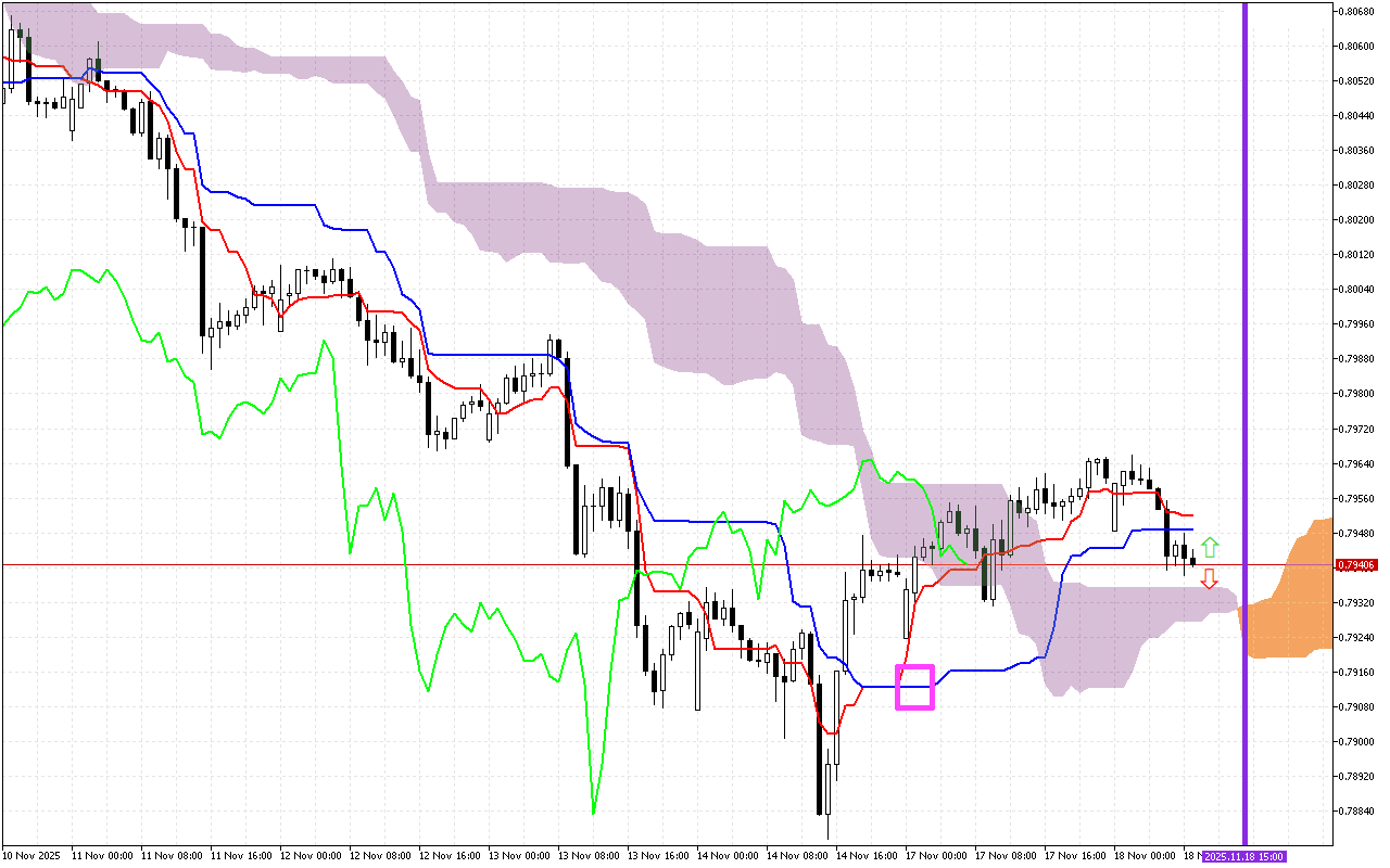 В текущем срезе рынка цена закрепилась ниже облака Kumo. Границы облака образуют динамическую зону сопротивления для цены.