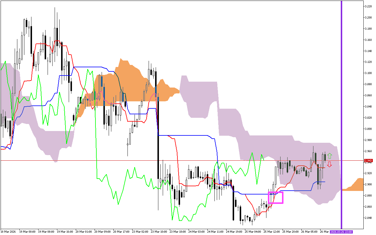 При этом цена находится выше облака Kumo, которое действует как потенциальная зона поддержки.