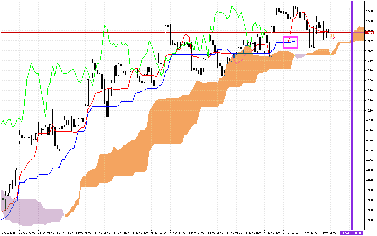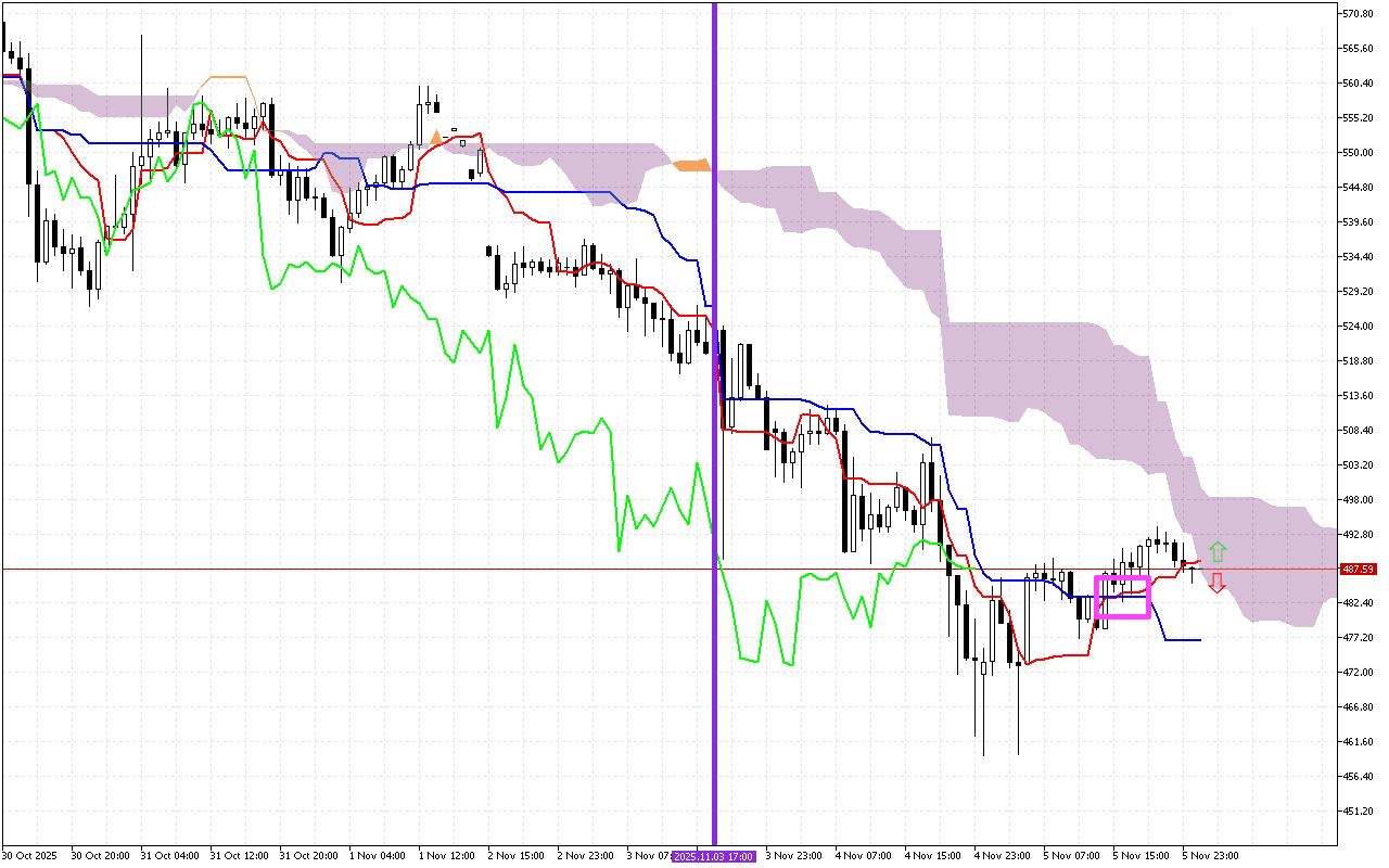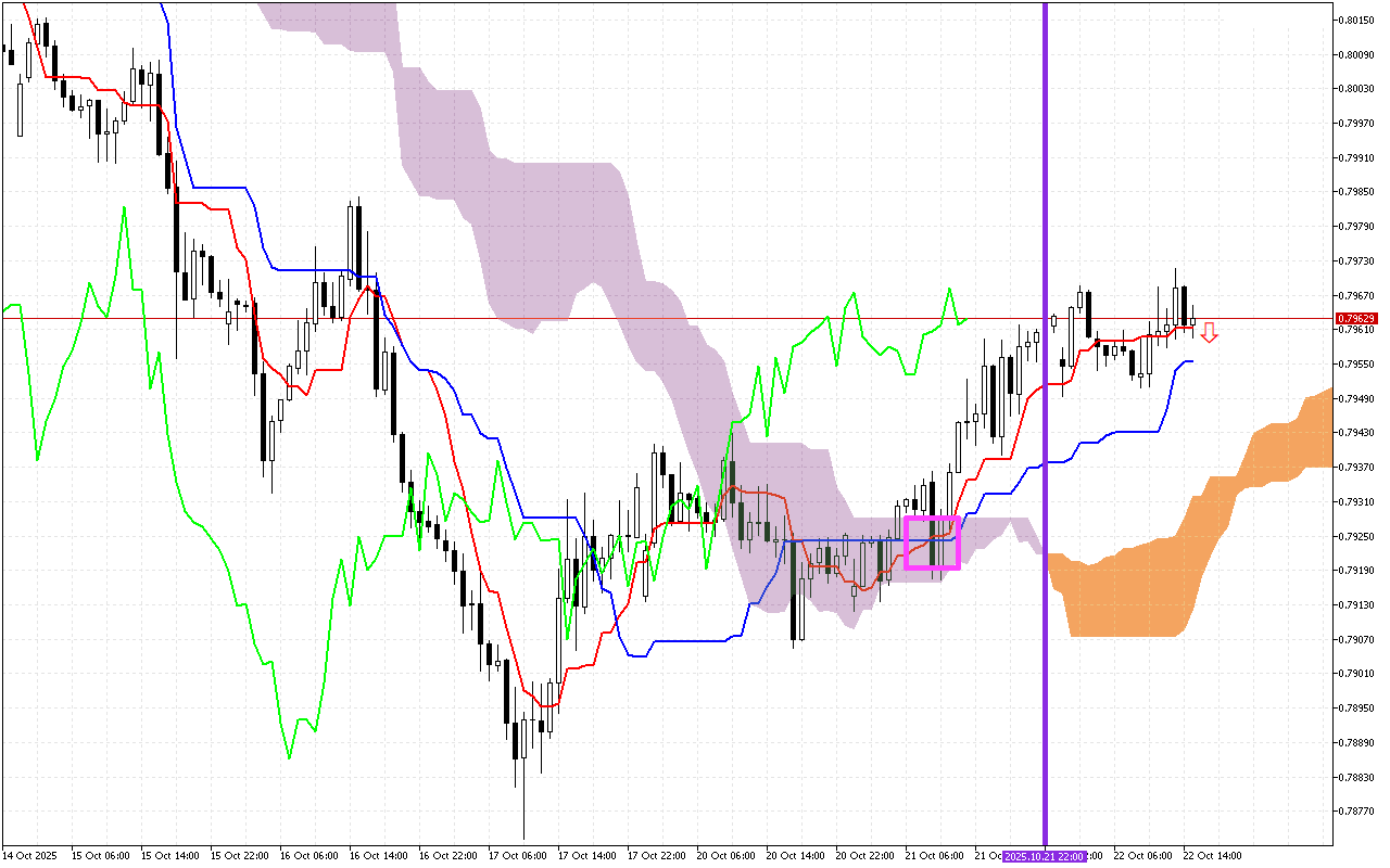 Главным сигналом последних торговых сессий является пересечение линий Tenkan и Kijun, обозначенное на графике розовым квадратом. Это негативный сигнал, указывающий на смену предстоящей тенденции на нисходящую.