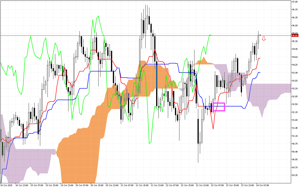 Облако Kumo окрашено в сиреневый цвет, что указывает на приоритет нисходящего вектора движения цены.