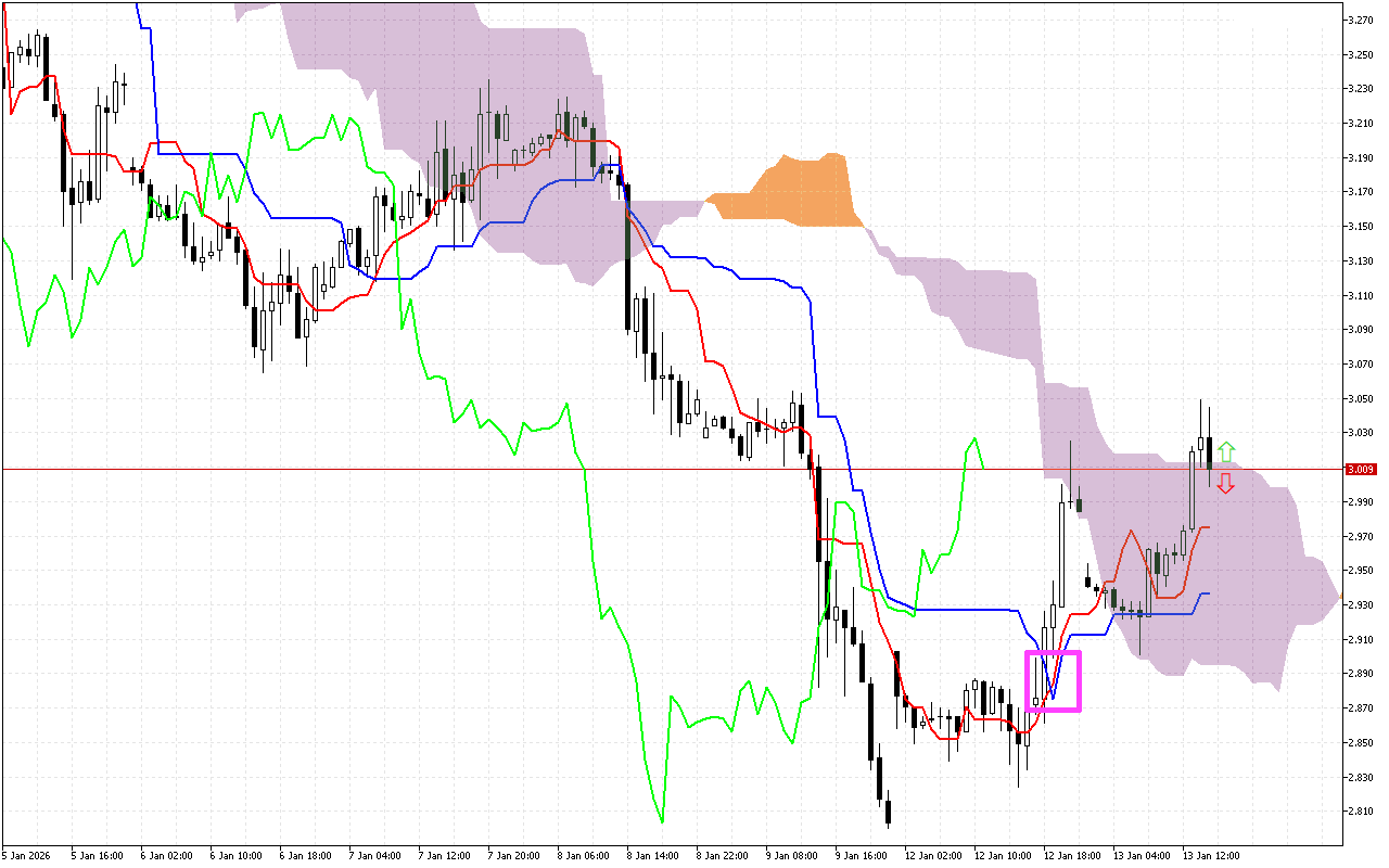 Облако Kumo окрашено в оранжевый цвет, что указывает на склонность рынка к продолжению восходящего движения.